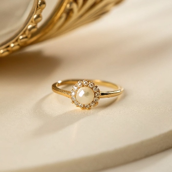 This elegant ring features a luminous round pearl at its center, symbolizing purity, protection, and inner strength. Surrounding the pearl, a delicate halo of tiny sparkling stones adds a soft radiance, creating a refined and timeless silhouette.