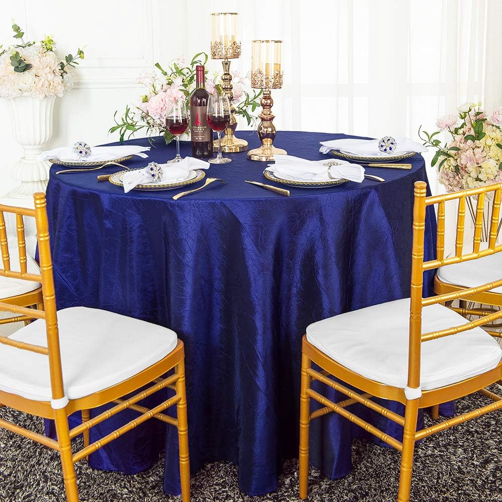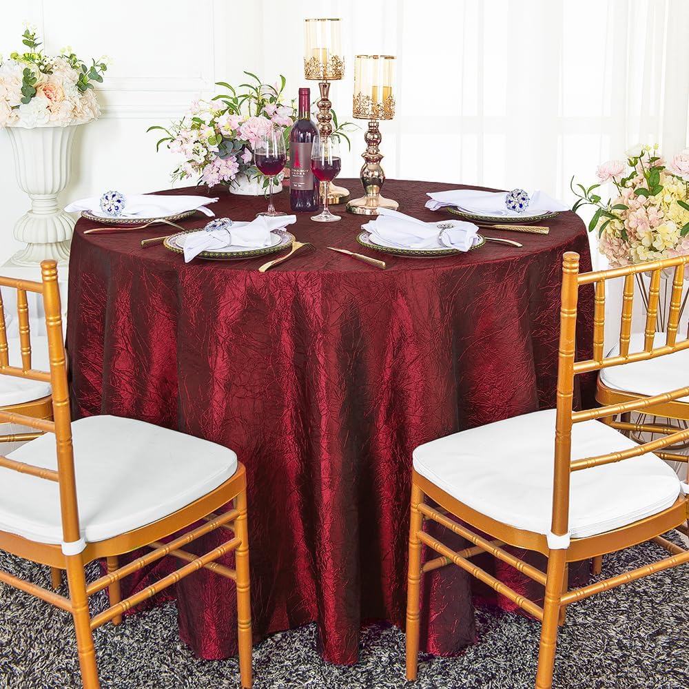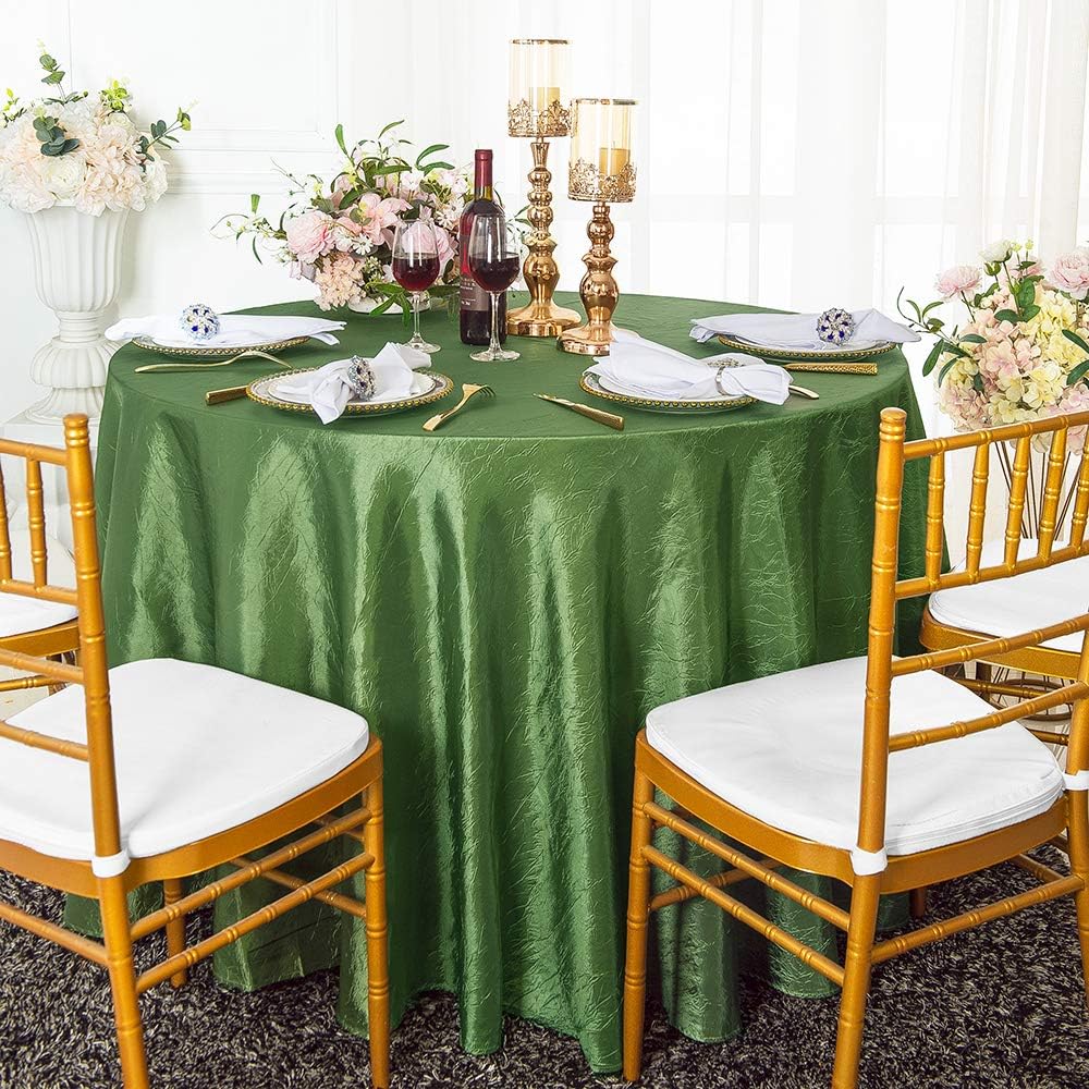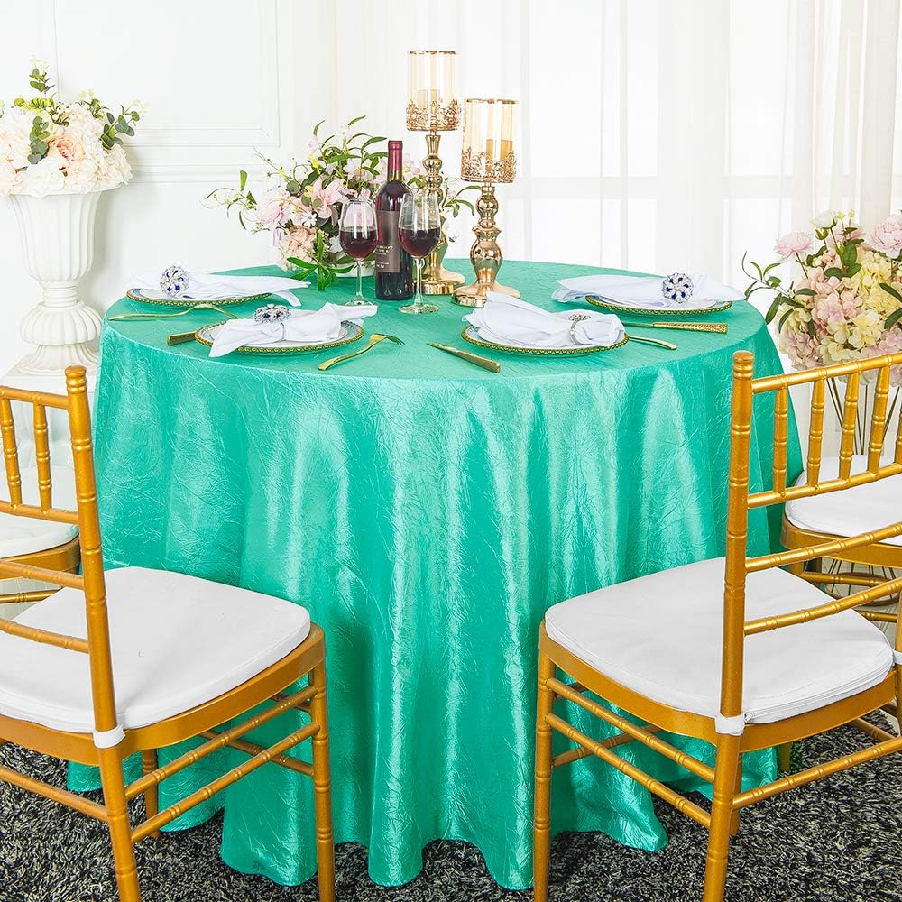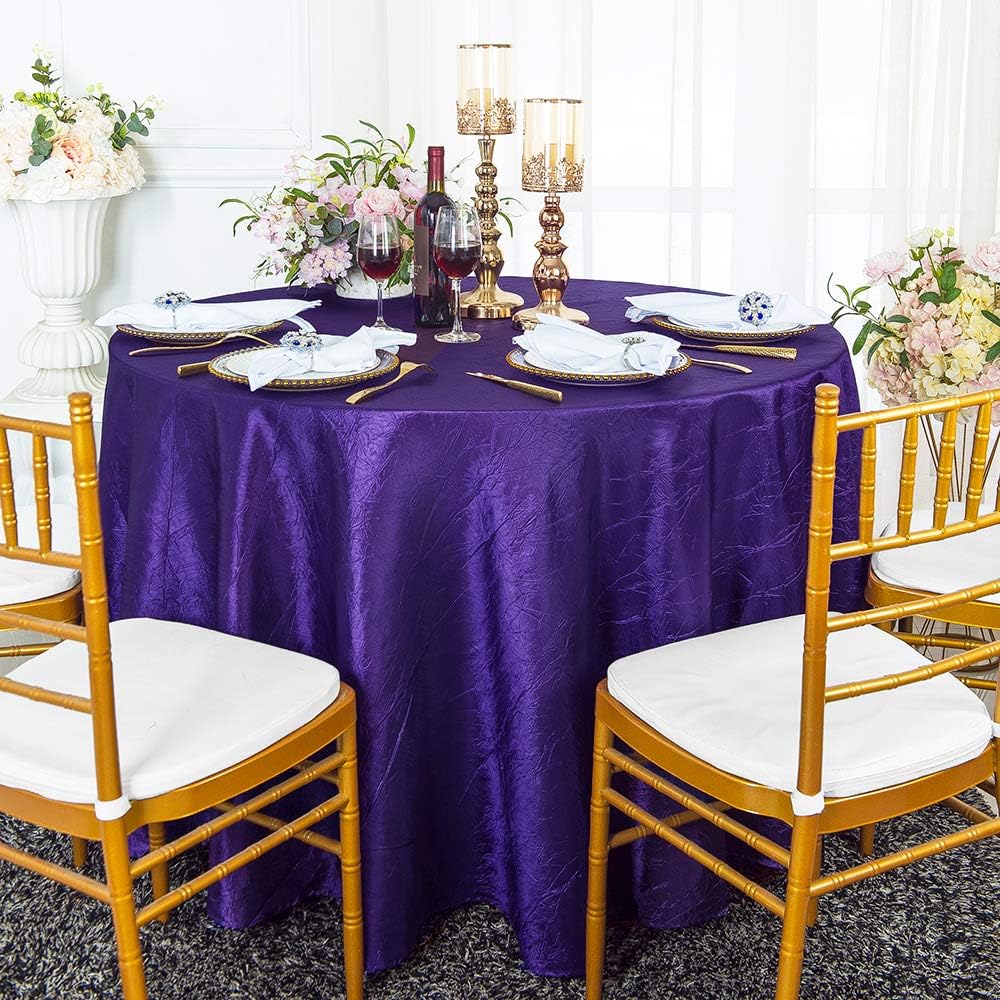 Condition: Wholesale brand new high quality 132" seamless round crushed crinkle taffeta tablecloths, table linens. Round crushed crinkle taffeta tablecloths made from a high quality seamless crushed crinkle taffeta material. Size: 132 inch Round Seamless. Edge: Hemmed. How to Care: Round crushed taffeta tablecloth can be machine wash in cold water. Machine dry at low temperature or Hang dry, and remove as soon as the cycle is complete, Remove promptly from drying cycle to avoid wrinkles, If ironing is needed, Use a moderately warm iron. Uses: round crushed crinkle taffeta tablecloth linens use for table cover overlay, wedding, parties, celebrations and all other special events. Note: Price for round crushed crinkle taffeta tablecloth only, other decorations are not included.