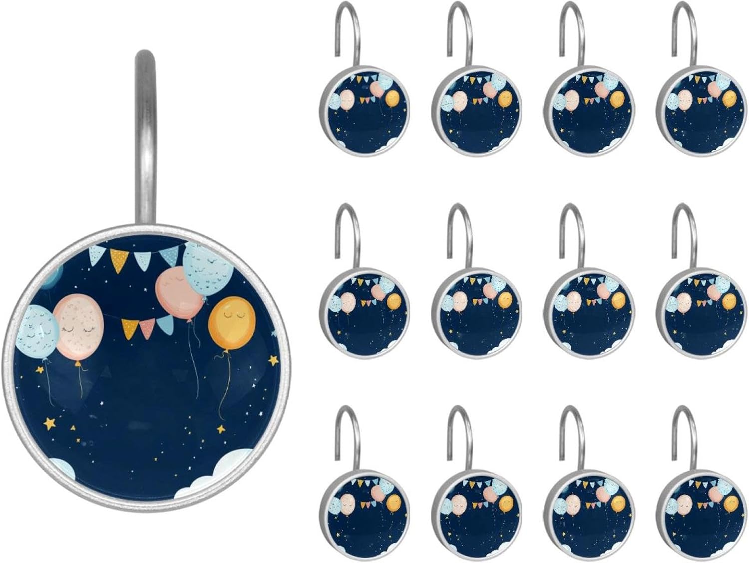 MATERIAL: glass, stainless steel. These shower curtain hooks can be decoration bathroom and will be long-lasting.12 pieces of shower curtain hooks, round crystal glass decoration, printed patterns, silver hooks to match various styles of bathroom shower curtains. SIZE: Crystal glass diameter of round shower curtain hook is 1.45x1.45in/ 3.7x3.7cm. The shower curtain hooks diameter is about 1.1in, 12 pieces shower curtain hooks are suitable for rod of 8-28mm(0.3"-1.1"). RUST RESISTANT:Shower hooks are made of stainless steel and crystal glass, which is durable, rust-proof and corrosion-resistant, it will not rust suitable for wet bathroom environment. EASY TO INSTALL:Hand the shower curtain hooks hold securely on straight or curved shower curtain rods,slid easily and smoothly. Easy to install and decorate your bathroom. BEAUTIFUL AND ELEGANT:Beautiful Love hook add charming scenery for your bathroom, baby room, bedroom, living room, and the gorgeous style is easy to match with any kinds of bathroom shower curtain. EASY GLIDE: Open and close your shower curtain quickly and easily with the Shower Hooks, easily glides on shower curtain rods and tension rods. No snagging; no effort; no hassle PACKAGE: 12 shower curtain hooks in a pack.The bathroom curtain hook has a smooth appearance and can be hung on the pole to pull it at will. Special price 12 sets to meet your needs.