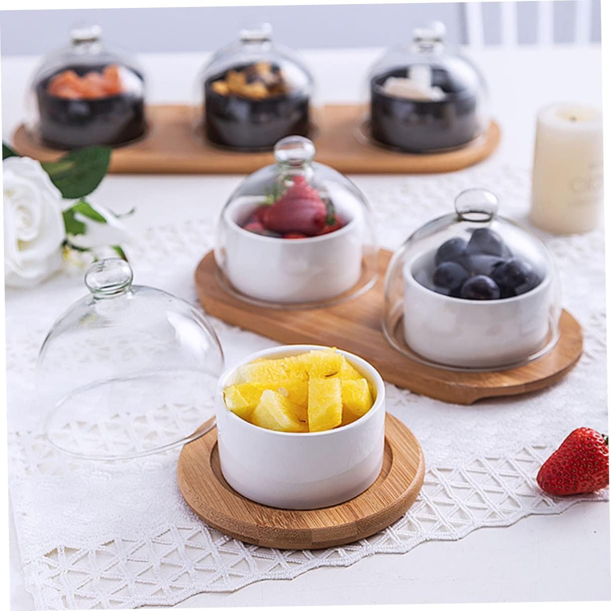 Package Include 2 x bowls 2 x covers 1 x tray Characteristics - Color: Assorted color Bowl for Dessert. - Size: 25.00X12.00X8.50cm/9.82X4.72X3.34in Fruit Bowl. - Material: Wood + glass + ceramics Food Serving Bowls. - It can be wonderfully used as a food serving bowl, which will increase your appetite greatly Ceramics Dessert Bowl. - It is made of high-grade material, which can be used for a long time. Dessert Bowl - You can send it to your families and friends as a present, they will be happy Food Serving Bowl. - manufacture makes its surface smooth, and it is easy to clean with water. Salad Bowl - Stylish ceramics bowl, it is for restaurant, home, hotel and so on Ceramics Bowl.Goods InformationCeramics Bowl Fashionable ceramics bowl, it's home, restaurant, hotel and so on.Bowl for Dessert craftsmanship makes the surface smooth and easy to clean with water.Food Serving Bowls It can be used as a dessert bowl, and it will greatly increase your appetite