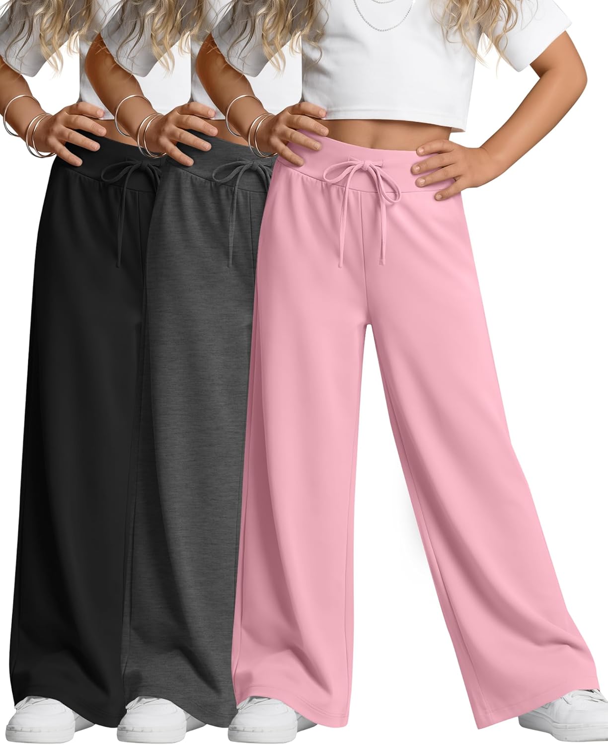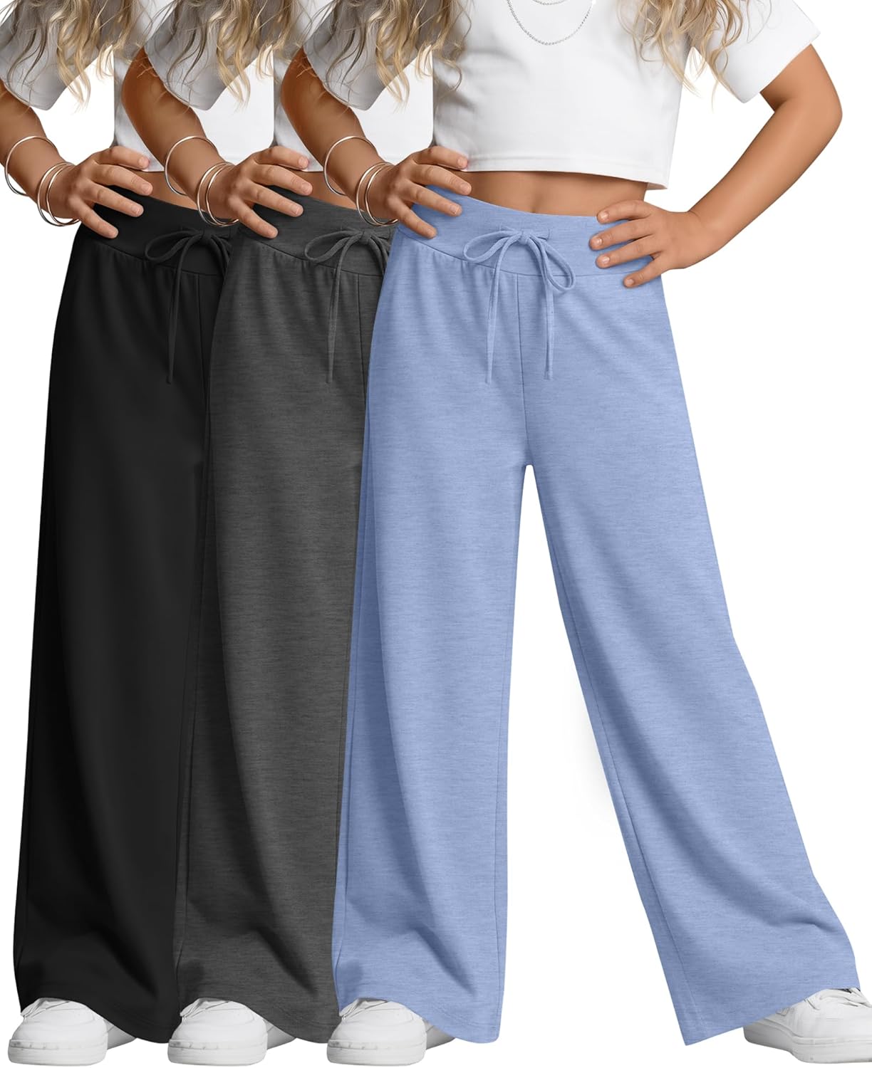 Features: Details about the cut and design: The girl's sweatpants are normal version design, suit for most body shape. Nice present for girls: The are suitable for girls of different ages, making it a good present for family Specifications: Material: 60% Polyester, 35% Rayon, 5% Spandex Package includes: 3 x girl's wide leg sweatpants Notes: Manual measurement, please allow slight errors on size. The color may exist a slight difference due to different screen display. Check the our size chart before purchasing, it would help you find a more accurate size for yourself. Hand/machine wash in gentle with cold water, hang to dry or line dry, do not bleach, warm iron if needed, wash dark colors separately