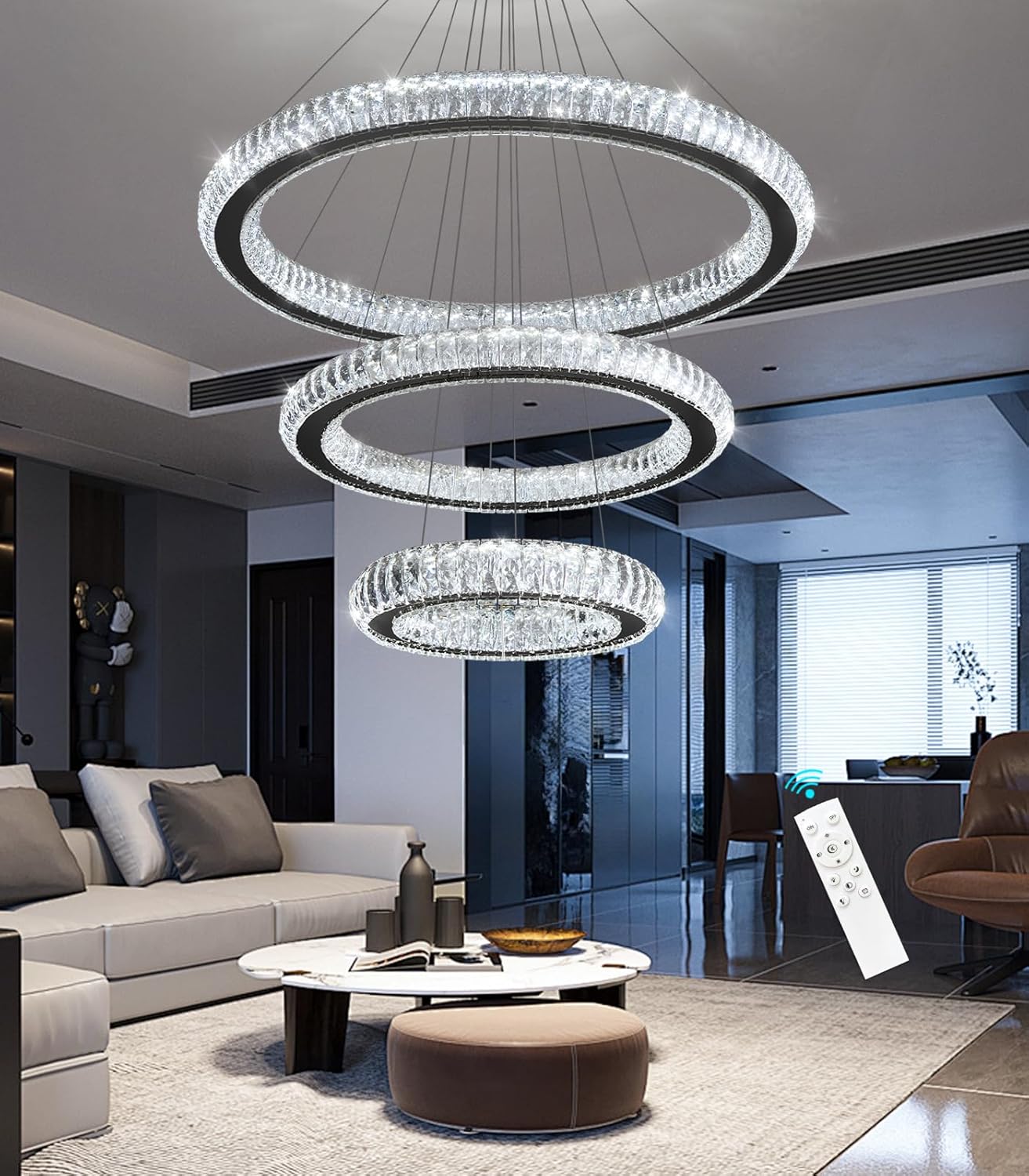 Transform your space with this stunning indoor modern glam crystal chandelier. The sleek stainless steels metal ring design creates a dramatic focal point while casting dimmable LED illumination throughout your room. Perfect for dining rooms, living spaces, or bedrooms, this luxury lighting fixture combines contemporary style with glamorous crystal embellishments. The chandelier features convenient remote control operation with dimming capabilities to set the perfect ambiance. This ceiling-mounted fixture makes a bold statement while maintaining elegant proportions. The hardwired installation without assembly, the result is a luxury lighting solution that elevates any interior. The remote controller allows easy adjustment of light levels from anywhere in the room. This modern chandelier includes all mounting hardware for a secure flush-mount installation.
