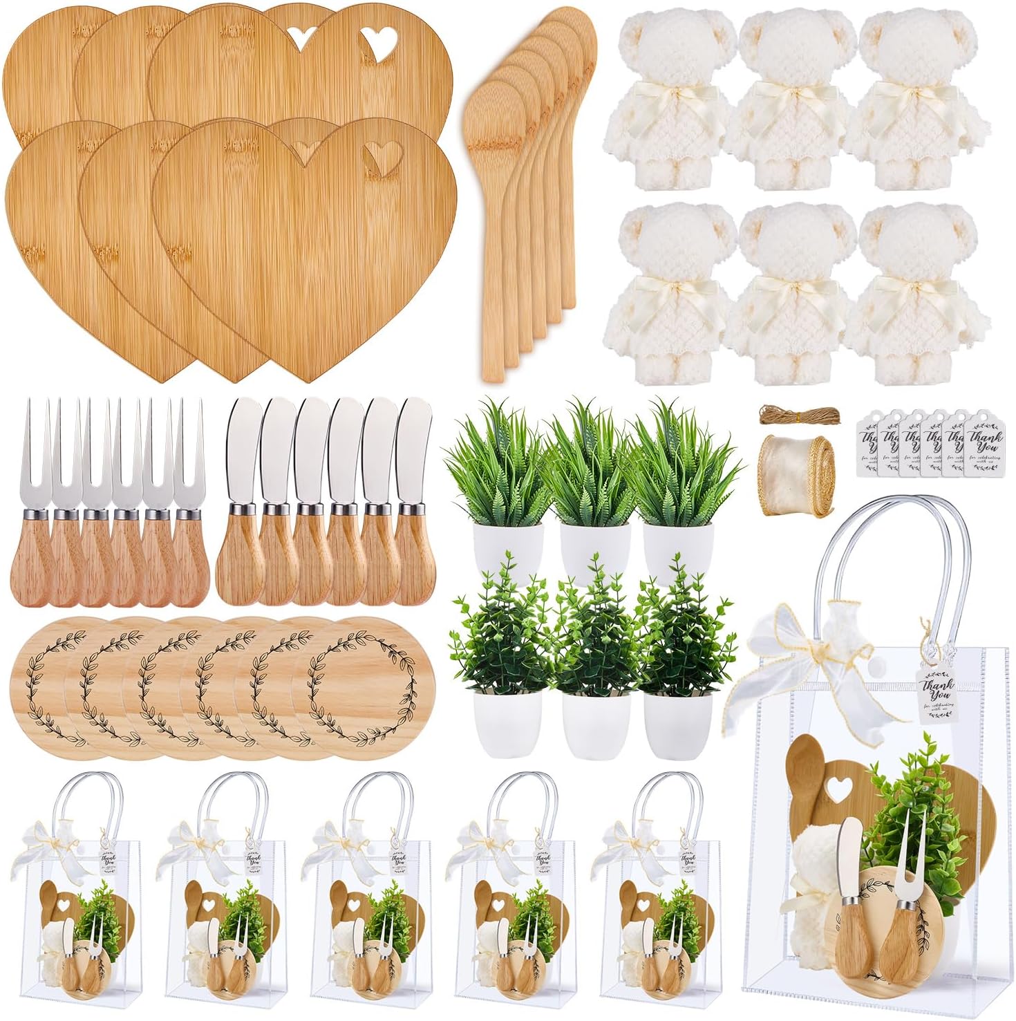 Included Components 6Pcs Bear Style Towels and 6Pcs Artificial Potted Plants, 6Pcs Charming Gift Tags and 6Pcs Gift Bags, 6Pcs Spoons and 6Pcs Forks and 6Pcs Butter Spreaders, 6Pcs Square Shaped Cheese Boards, 6Pcs Wooden Coasters and A Roll of String and A Roll of Ribbon