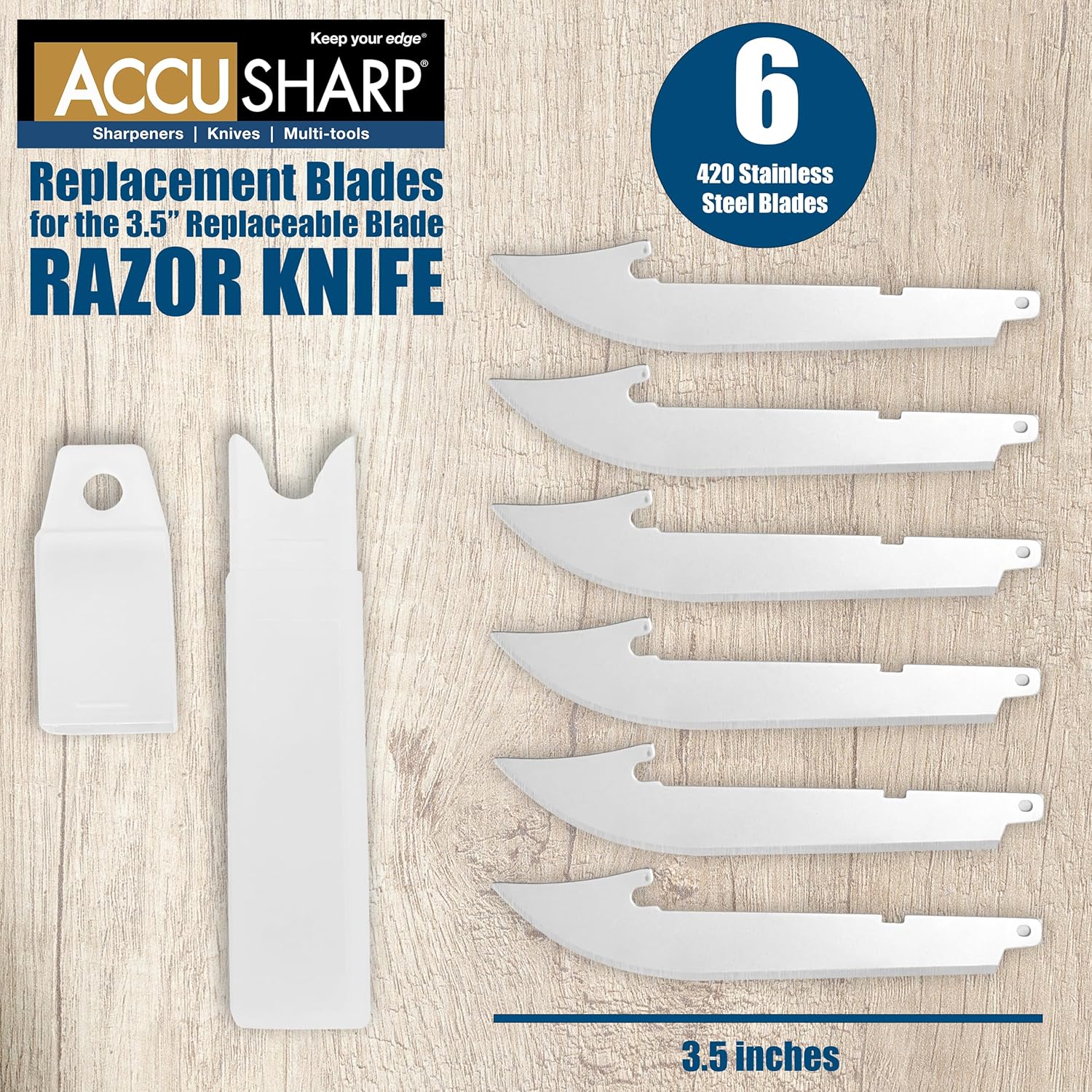 This bundle includes AccuSharp's 3.5" Blue Razor Knife and 6-Piece Set of 3.5" Razor Blade Replacement.