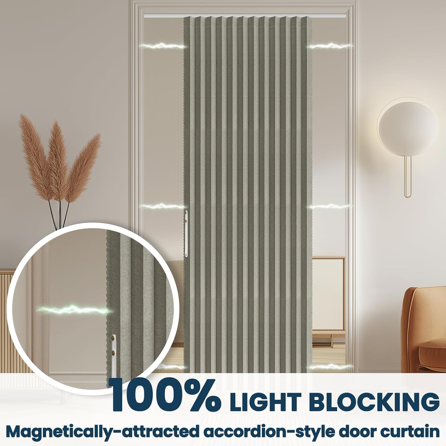 AJAZZ 100% Blackout Accordion Door Invisible Folding Doors Interior Magnetic Door Curtain for Bedroom Living Room Kitchen Doors Curtains Sets Included Tracks (1Panel, 53W x 79 L, Grey)