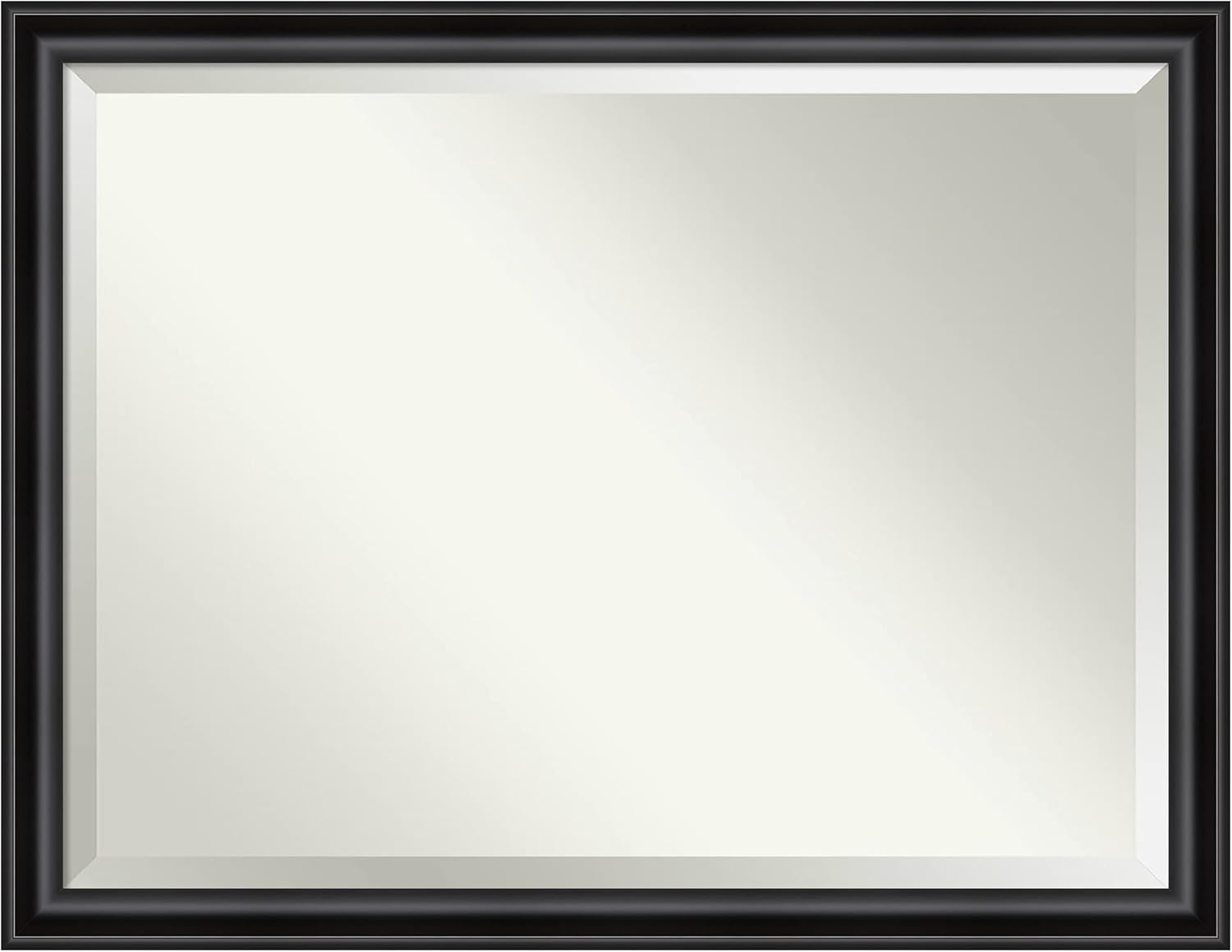 PRODUCT: Amanti Art Beveled Bathroom Wall Mirror; OUTER SIZE: 45.25 x 35.25 inches; FRAME: Tuxedo Black; FRAME FINISH: Glossy; FRAME COLOR: Black. The Tuxedo Black frame is a contemporary, matte black, flat panel frame with high shine polished black inner edge. Give your bathroom the finishing touch with this framed wall mirror. Individually made using traditional custom framing techniques, it has the quality you would expect from your local frame shop. It holds its value with premium finishing that can be appreciated up close. Because of our attention to detail and focus on artistry, architects, interior designers, and homeowners alike choose this mirror to create beautiful living spaces.