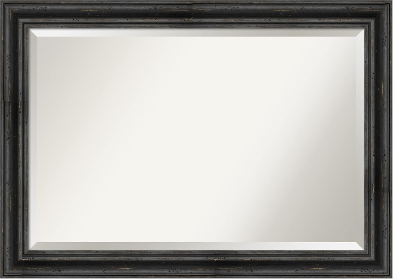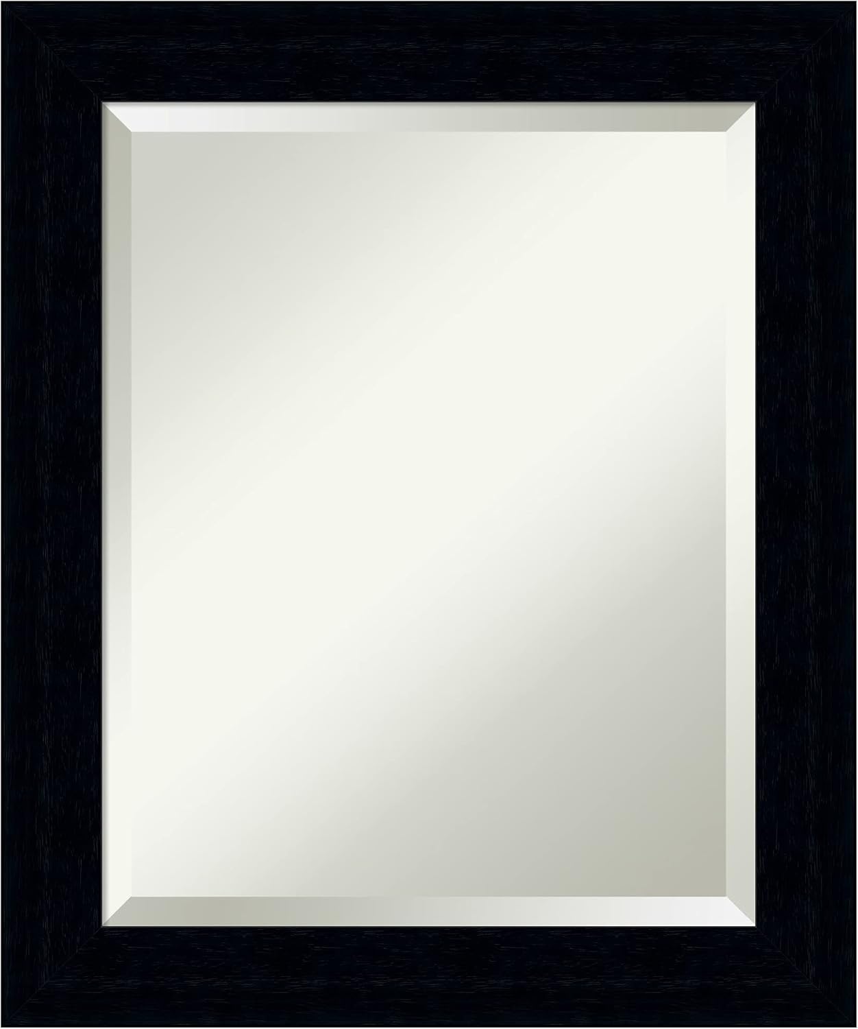 PRODUCT: Amanti Art Beveled Wood Wall Mirror; OUTER SIZE: Exactly 23.5 x 29.5 inches; FRAME: Rustic Pine Black; FRAME FINISH: Distressed; FRAME COLOR: Black. The Rustic Pine Black frame is a wide, rustic, black frame with distressed woodgrain and weathered pockmark details. Light, natural wood shows through the black finish. Give your home or office the finishing touch with this 100% real wood-framed wall mirror. Individually made using traditional custom framing techniques, it has the quality you would expect from your local frame shop. It holds its value with premium finishing that can be appreciated up close. Because of our attention to detail and focus on artistry, architects, interior designers, and homeowners alike choose this mirror to create beautiful living spaces.