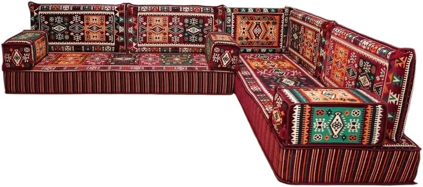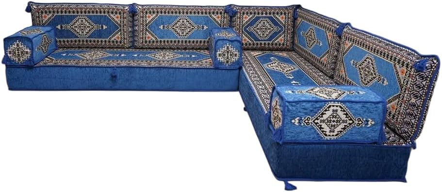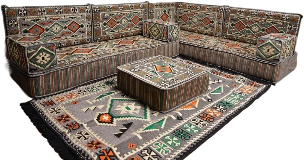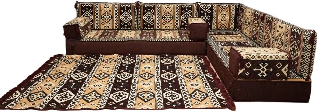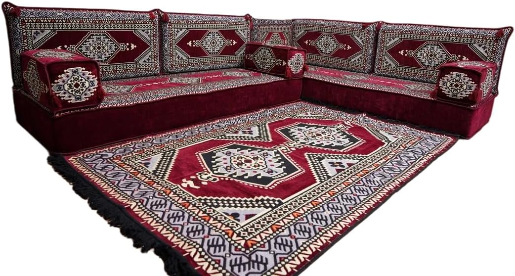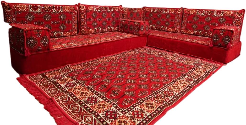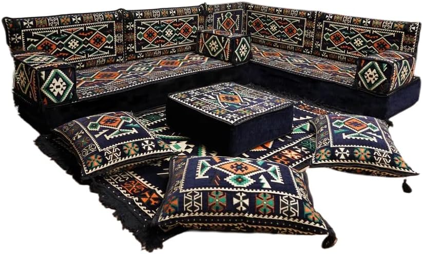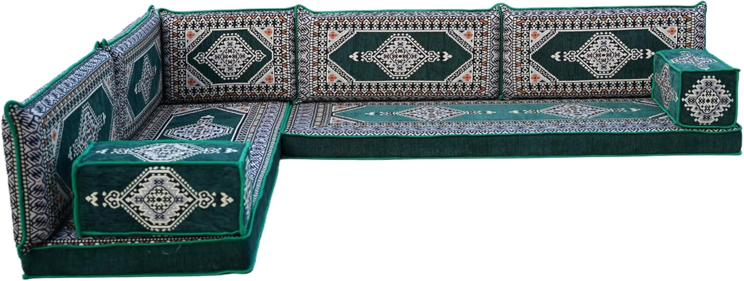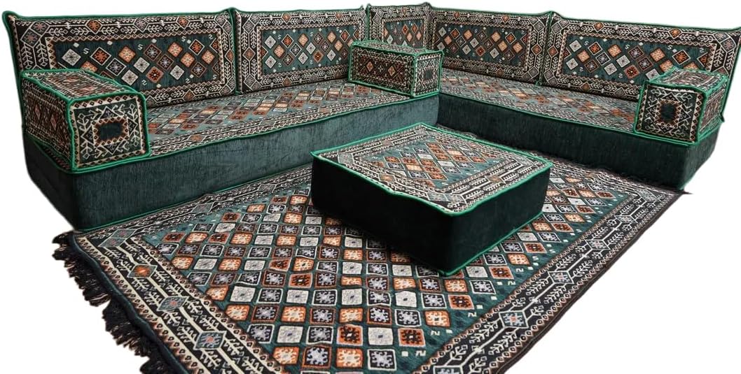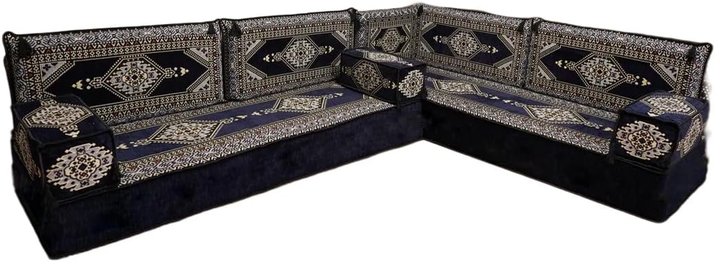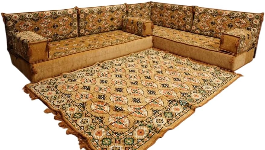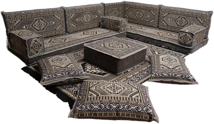 Bring elegance and comfort to your home with our Traditional Arabic Majlis Floor Sofa Set. Perfectly designed for floor seating, our handmade sofas embody the timeless beauty of Arabic furniture. Inspired by classic jalsa and majlis seating styles, this versatile floor couch offers a cozy and luxurious addition to your living room or lounge. The high-quality craftsmanship and luxurious cushions ensure comfort and durability, while the traditional Arabic design adds a cultural touch to any space.Please Note: You will receive the exact configuration and cushion thickness of the variant you select from the listing page.What’s Included in Your Set?If you choose 'L Sofa Full Set' you will get these:-2 Floor Seating Cushions (190 x 70 cm / 75 x 27 inch)-4 Large Backrest Pillows (95 x 40 x 10 cm / 37 x 16 x 4 inch)-1 Small Backrest Pillow (60 x 40 x 10 cm / 24 x 16 x 4 inch)-2 Armrest Pillows (50 x 20 x 20 cm / 20 x 8 x 8 inch)-1 Matching Rug (120 x 180 cm / 47 x 71 inch)-1 Ottoman Couch (60 x 60 x 20 cm / 24 x 24 x 8 inch)-3 Pouf Pillows (70 x 50 cm / 27 x 20 inch)This sofa set comes in 14 separate pieces.If you choose 'L Sofa + Rug + Ottoman' you will get these:-2 Floor Seating Cushions (190 x 70 cm / 75 x 27 inch)-4 Large Backrest Pillows (95 x 40 x 10 cm / 37 x 16 x 4 inch)-1 Small Backrest Pillow (60 x 40 x 10 cm / 24 x 16 x 4 inch)-2 Armrest Pillows (50 x 20 x 20 cm / 20 x 8 x 8 inch)-1 Matching Rug (120 x 180 cm / 47 x 71 inch)-1 Ottoman Couch (60 x 60 x 20 cm / 24 x 24 x 8 inch)This sofa set comes in 11 separate pieces.If you choose 'L Sofa + Rug' you will get these:-2 Floor Seating Cushions (190 x 70 cm / 75 x 27 inch)-4 Large Backrest Pillows (95 x 40 x 10 cm / 37 x 16 x 4 inch)-1 Small Backrest Pillow (60 x 40 x 10 cm / 24 x 16 x 4 inch)-2 Armrest Pillows (50 x 20 x 20 cm / 20 x 8 x 8 inch)-1 Matching Rug (120 x 180 cm / 47 x 71 inch)This sofa set comes in 10 separate pieces.If you choose 'L Sofa Only' you will get these:-2 Floor Seating Cushions (190 x 70 cm / 75 x 27 inch)-4 Large Backrest Pillows (95 x 40 x 10 cm / 37 x 16 x 4 inch)-1 Small Backrest Pillow (60 x 40 x 10 cm / 24 x 16 x 4 inch)-2 Armrest Pillows (50 x 20 x 20 cm / 20 x 8 x 8 inch)This sofa set comes in 9 separate pieces.The thickness of the FLOOR SEATING CUSHIONS will be based on the variant you choose from the listing page: 4" Thickness (10 cm) or 8" Thickness (20 cm)