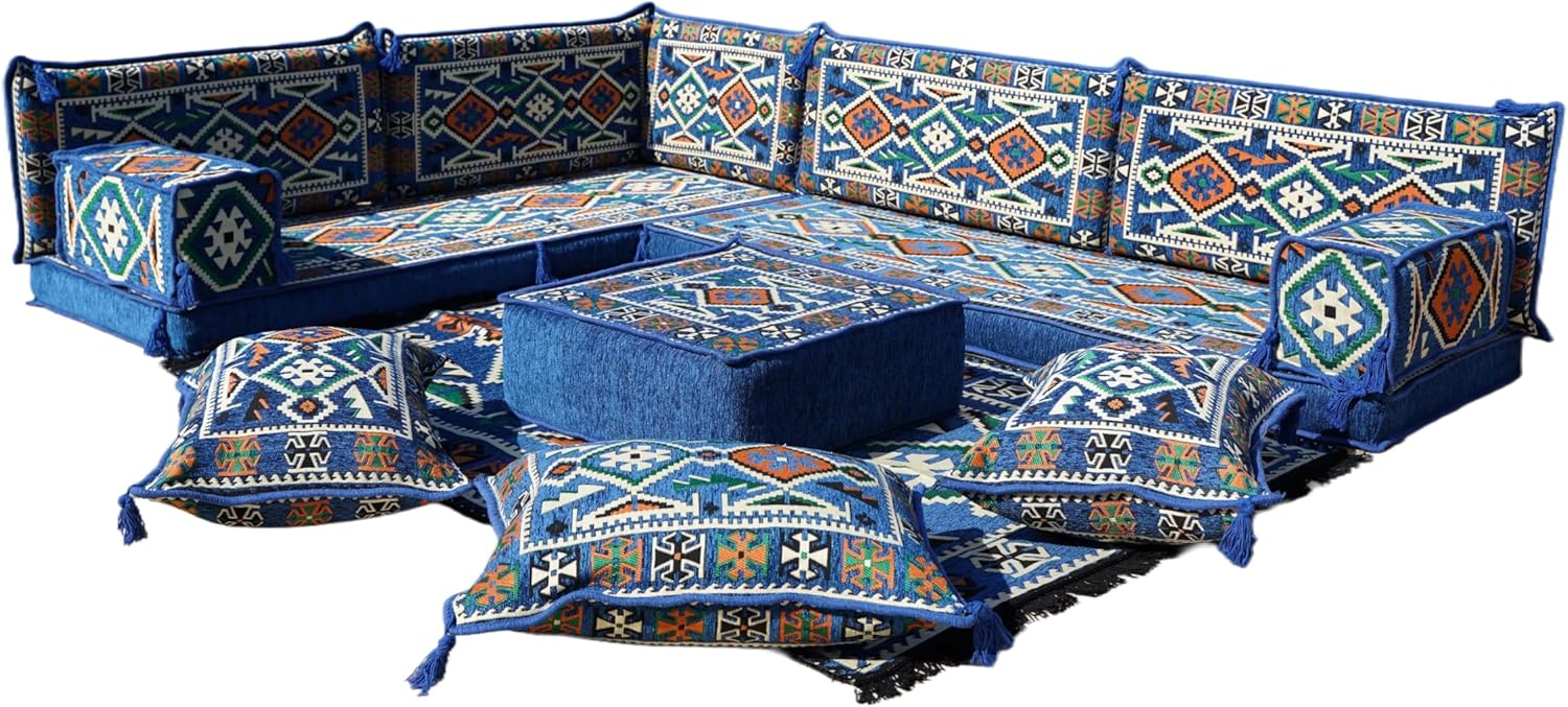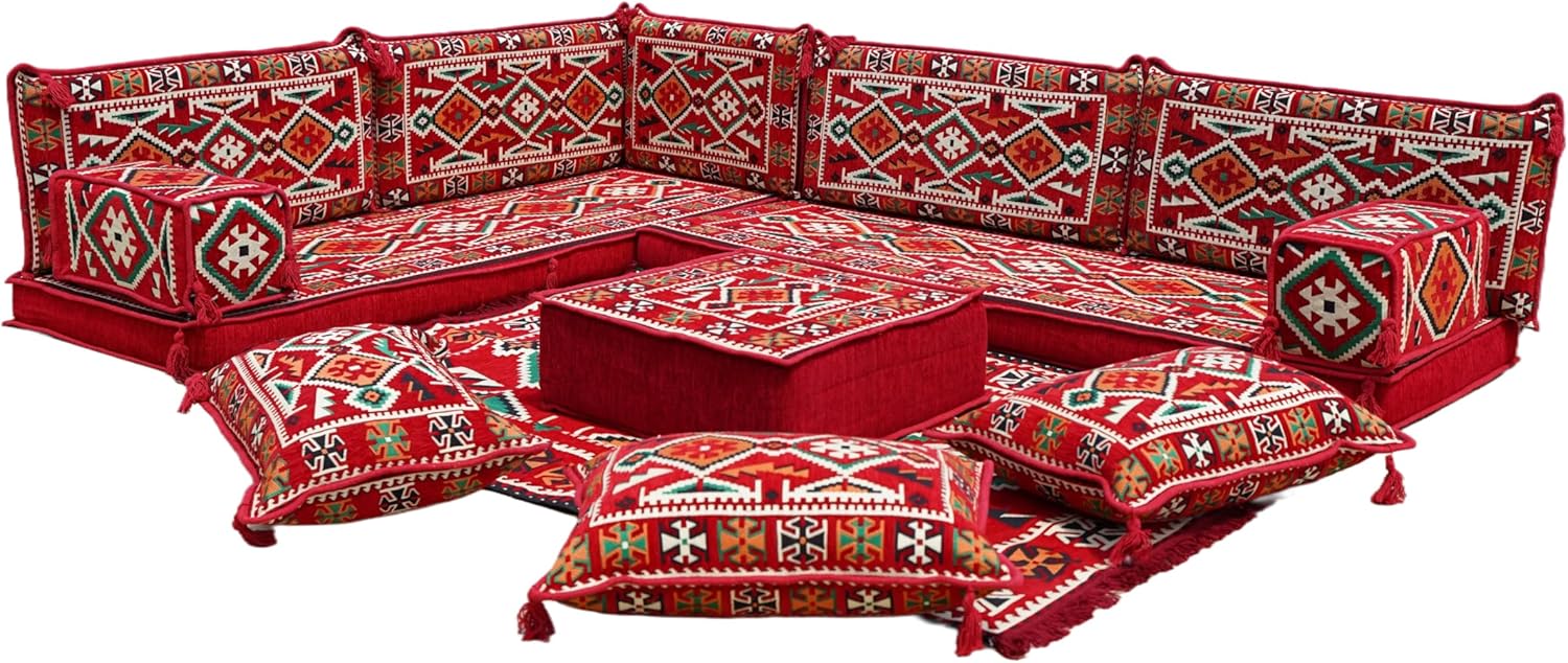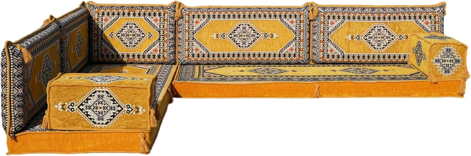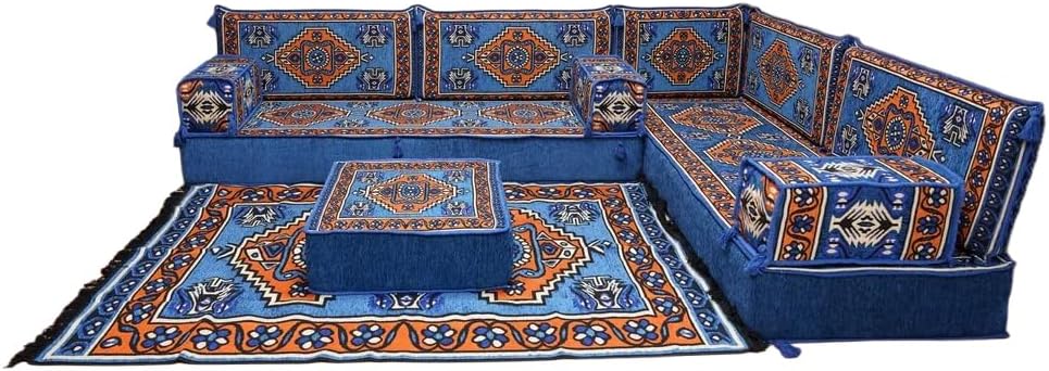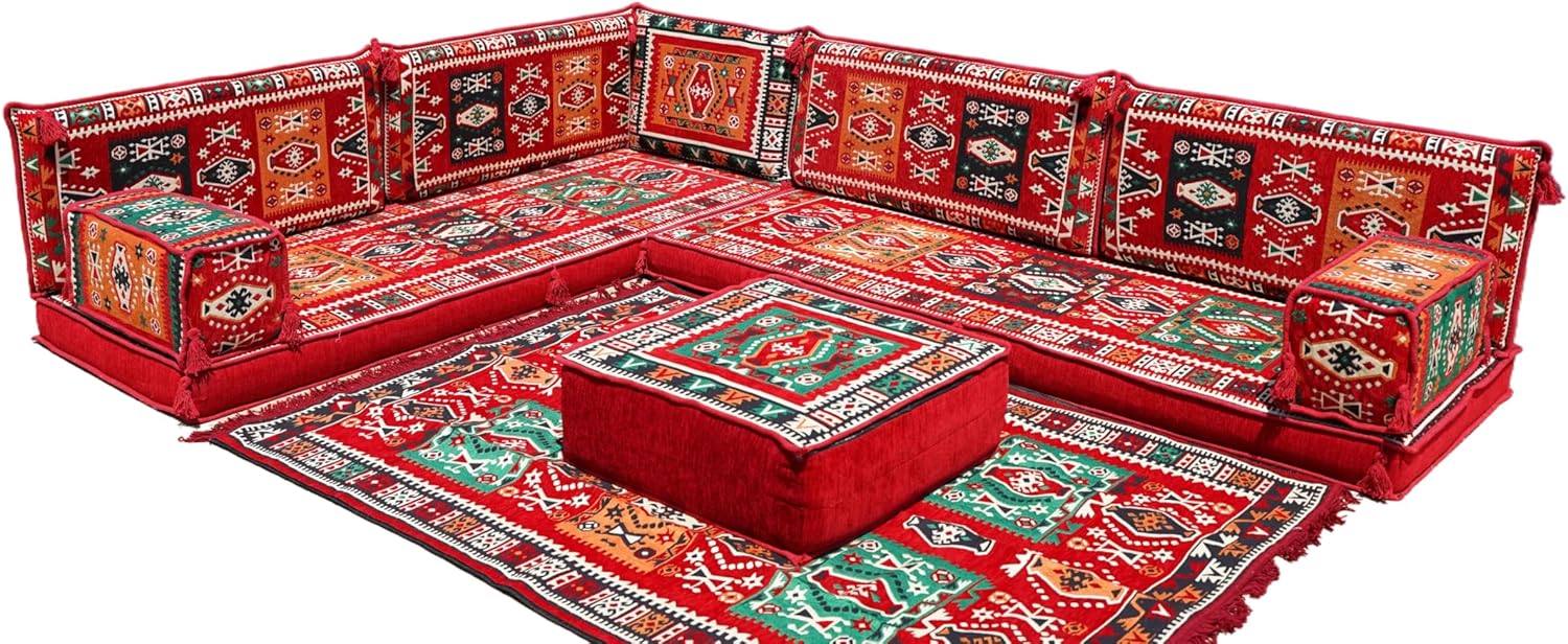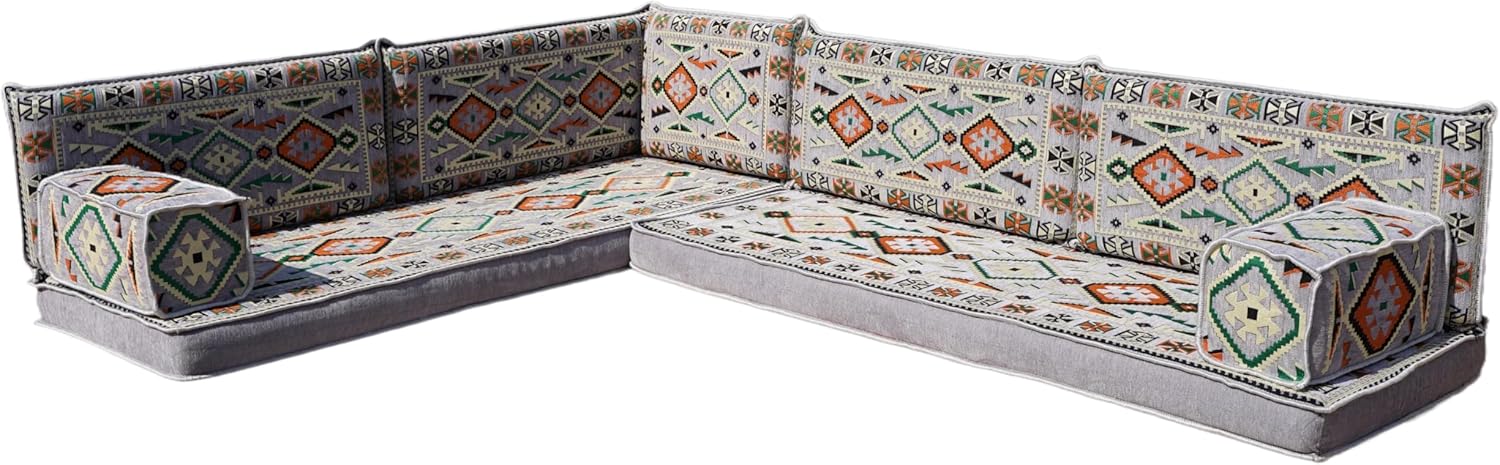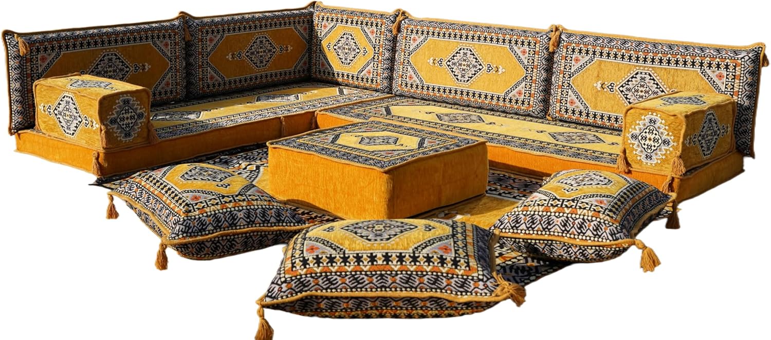 Bring elegance and comfort to your home with our Traditional Arabic Majlis Floor Sofa Set. Perfectly designed for floor seating, our handmade sofas embody the timeless beauty of Arabic furniture. Inspired by classic jalsa and majlis seating styles, this versatile floor couch offers a cozy and luxurious addition to your living room or lounge. The high-quality craftsmanship and luxurious cushions ensure comfort and durability, while the traditional Arabic design adds a cultural touch to any space.Please Note: You will receive the exact configuration and cushion thickness of the variant you select from the listing page.What’s Included in Your Set?If you choose 'L Sofa Full Set' you will get these:-2 Floor Seating Cushions (190 x 70 cm / 75 x 27 inch)-4 Large Backrest Pillows (95 x 40 x 10 cm / 37 x 16 x 4 inch)-1 Small Backrest Pillow (60 x 40 x 10 cm / 24 x 16 x 4 inch)-2 Armrest Pillows (50 x 20 x 20 cm / 20 x 8 x 8 inch)-1 Matching Rug (120 x 180 cm / 47 x 71 inch)-1 Ottoman Couch (60 x 60 x 20 cm / 24 x 24 x 8 inch)-3 Pouf Pillows (70 x 50 cm / 27 x 20 inch)This sofa set comes in 14 separate pieces.If you choose 'L Sofa + Rug + Ottoman' you will get these:-2 Floor Seating Cushions (190 x 70 cm / 75 x 27 inch)-4 Large Backrest Pillows (95 x 40 x 10 cm / 37 x 16 x 4 inch)-1 Small Backrest Pillow (60 x 40 x 10 cm / 24 x 16 x 4 inch)-2 Armrest Pillows (50 x 20 x 20 cm / 20 x 8 x 8 inch)-1 Matching Rug (120 x 180 cm / 47 x 71 inch)-1 Ottoman Couch (60 x 60 x 20 cm / 24 x 24 x 8 inch)This sofa set comes in 11 separate pieces.If you choose 'L Sofa + Rug' you will get these:-2 Floor Seating Cushions (190 x 70 cm / 75 x 27 inch)-4 Large Backrest Pillows (95 x 40 x 10 cm / 37 x 16 x 4 inch)-1 Small Backrest Pillow (60 x 40 x 10 cm / 24 x 16 x 4 inch)-2 Armrest Pillows (50 x 20 x 20 cm / 20 x 8 x 8 inch)-1 Matching Rug (120 x 180 cm / 47 x 71 inch)This sofa set comes in 10 separate pieces.If you choose 'L Sofa Only' you will get these:-2 Floor Seating Cushions (190 x 70 cm / 75 x 27 inch)-4 Large Backrest Pillows (95 x 40 x 10 cm / 37 x 16 x 4 inch)-1 Small Backrest Pillow (60 x 40 x 10 cm / 24 x 16 x 4 inch)-2 Armrest Pillows (50 x 20 x 20 cm / 20 x 8 x 8 inch)This sofa set comes in 9 separate pieces.The thickness of the FLOOR SEATING CUSHIONS will be based on the variant you choose from the listing page: 4" Thickness (10 cm) or 8" Thickness (20 cm)