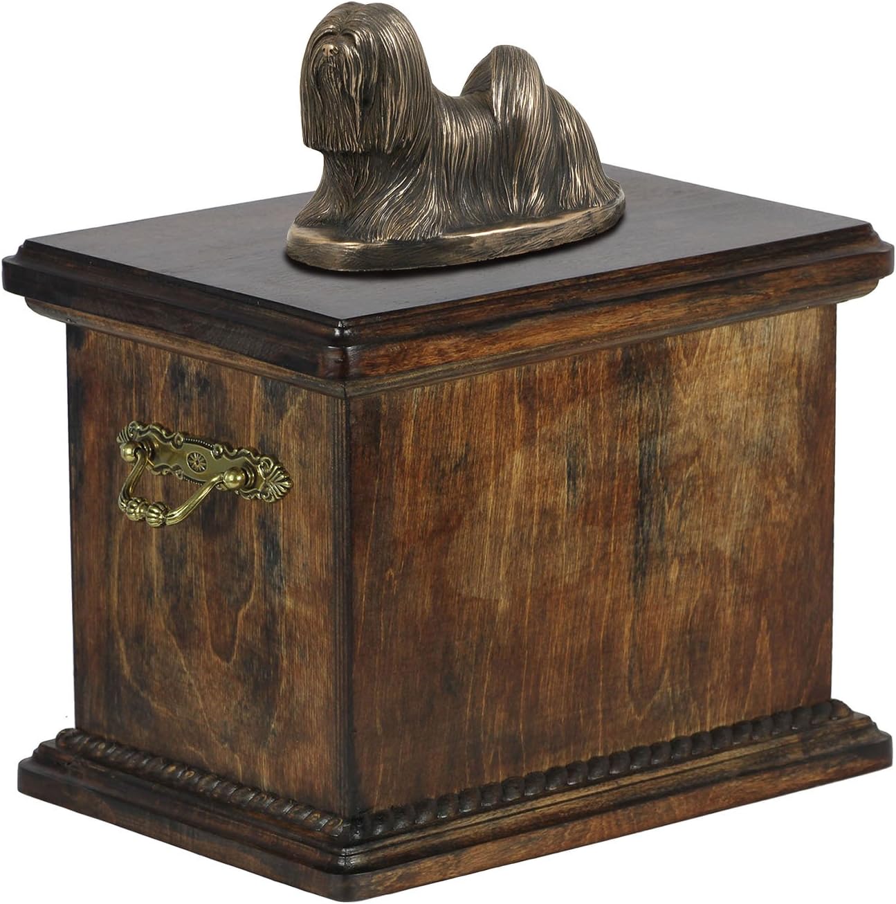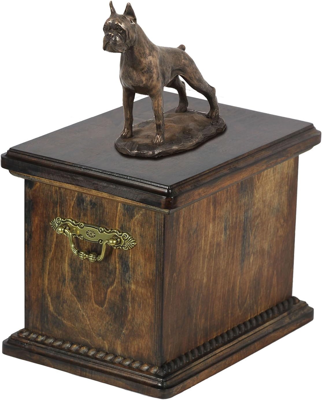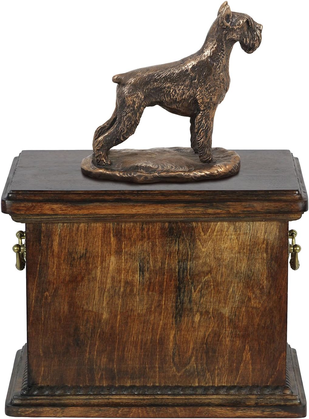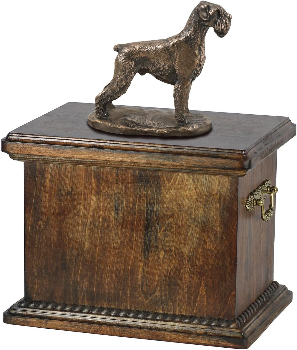 Introducing our Custom Dog Sitting Statue Memorial Urn, a work of art from the Art-Dog Collection. Handmade with precision, this urn is more than a resting place for ashes; it's a personalized and dignified tribute to the unique bond you shared with your furry companion. The focal point of this memorial is the beautifully crafted Dog sitting statue, made of Cold Cast Bronze, elegantly placed on a solid birch base. This combination of materials ensures durability and timeless beauty. The Art-Dog Collection offers a variety of statues representing different breeds, allowing you to select the one that captures the essence of your cherished pet. Crafted from birch wood, the urn is a durable and lasting symbol of your love. Brass handles and wreath-shaped decorations add a touch of sophistication, making this memorial a true work of art. The thoughtful design includes a removable lid, ensuring a convenient and heartfelt process for placing your pet's ashes. Beyond serving as a cremation box, this urn is a timeless symbol of enduring love. It is not just a memorial; it's a connection that will be cherished forever.