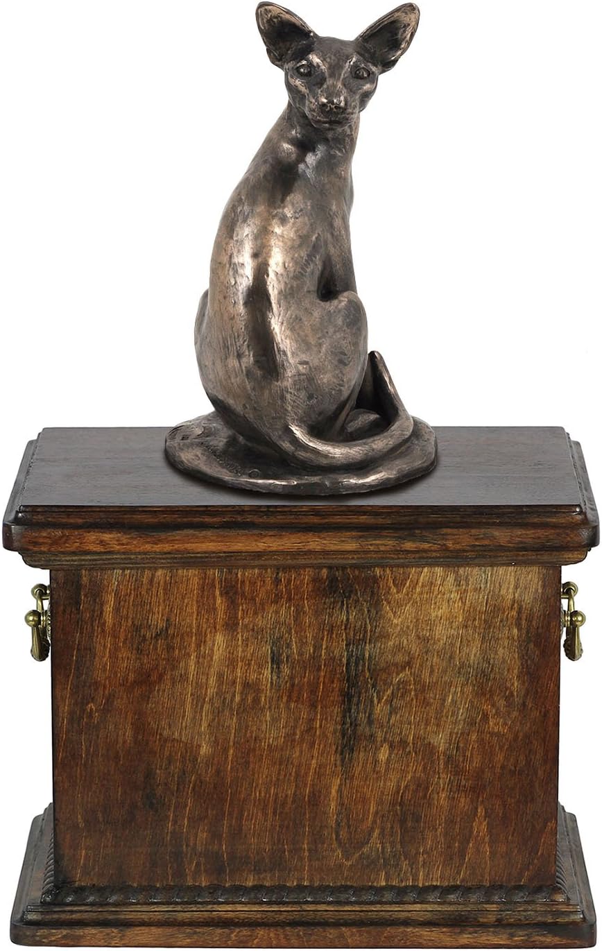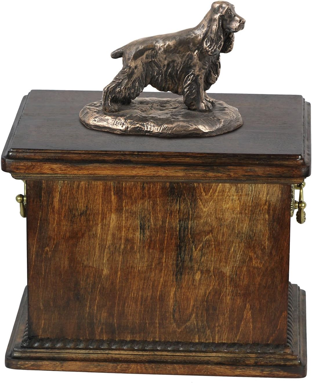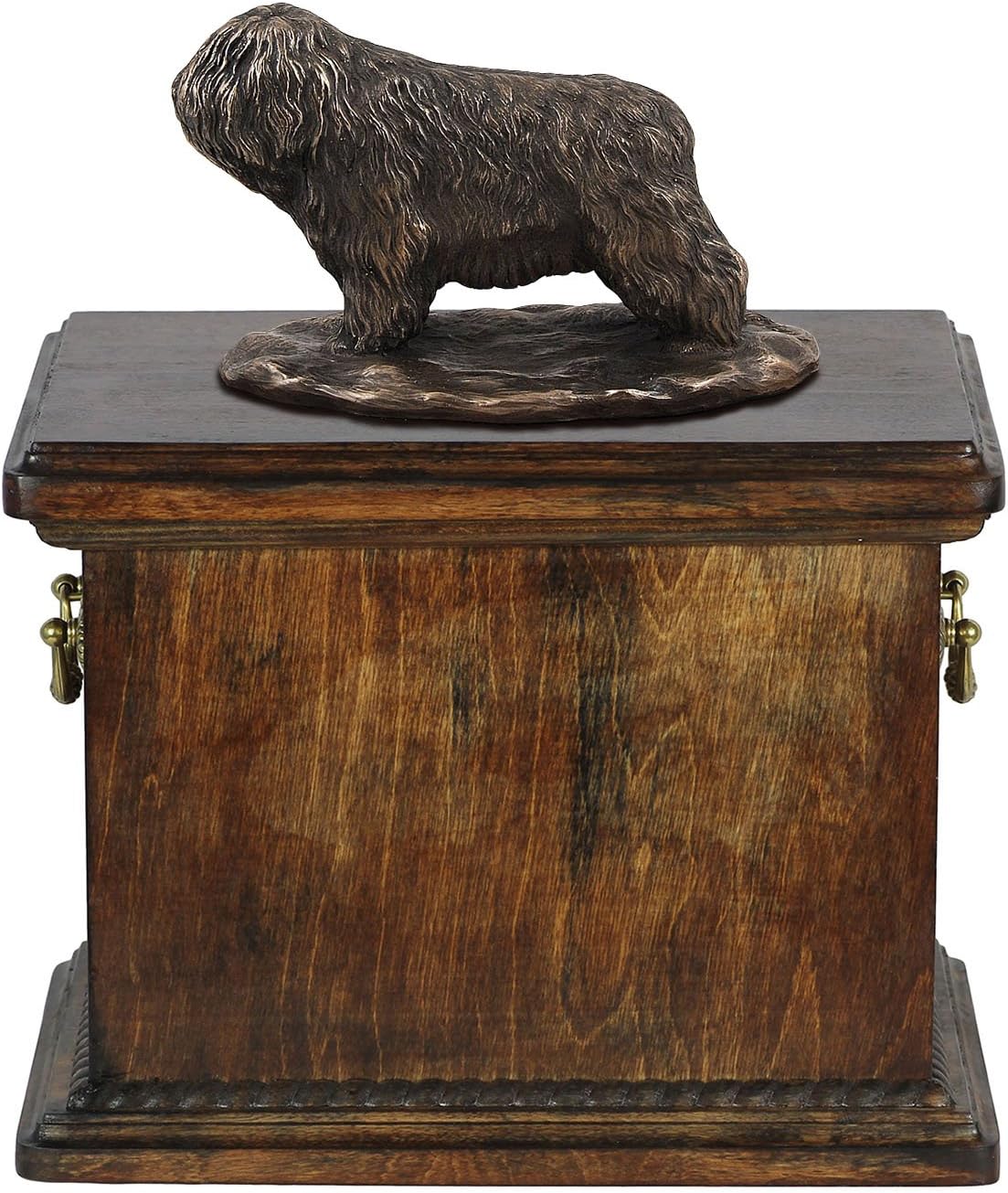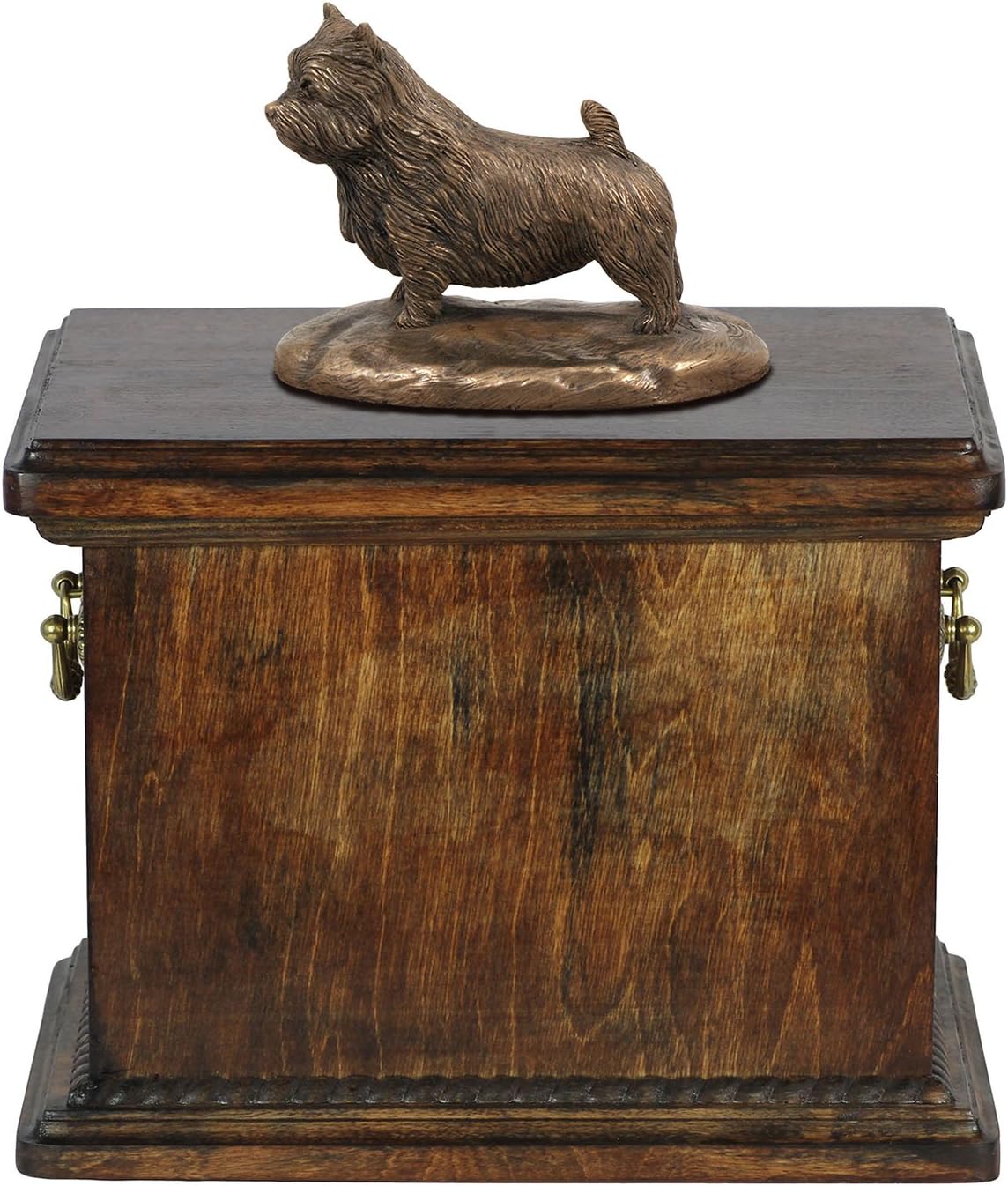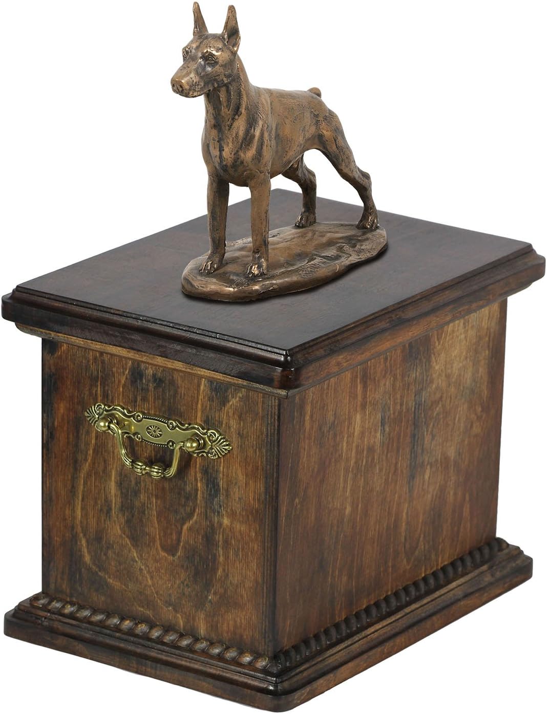 Introducing our Custom Dog Sitting Statue Memorial Urn, a work of art from the Art-Dog Collection. Handmade with precision, this urn is more than a resting place for ashes; it's a personalized and dignified tribute to the unique bond you shared with your furry companion. The focal point of this memorial is the beautifully crafted Dog sitting statue, made of Cold Cast Bronze, elegantly placed on a solid birch base. This combination of materials ensures durability and timeless beauty. The Art-Dog Collection offers a variety of statues representing different breeds, allowing you to select the one that captures the essence of your cherished pet. Crafted from birch wood, the urn is a durable and lasting symbol of your love. Brass handles and wreath-shaped decorations add a touch of sophistication, making this memorial a true work of art. The thoughtful design includes a removable lid, ensuring a convenient and heartfelt process for placing your pet's ashes. Beyond serving as a cremation box, this urn is a timeless symbol of enduring love. It is not just a memorial; it's a connection that will be cherished forever.