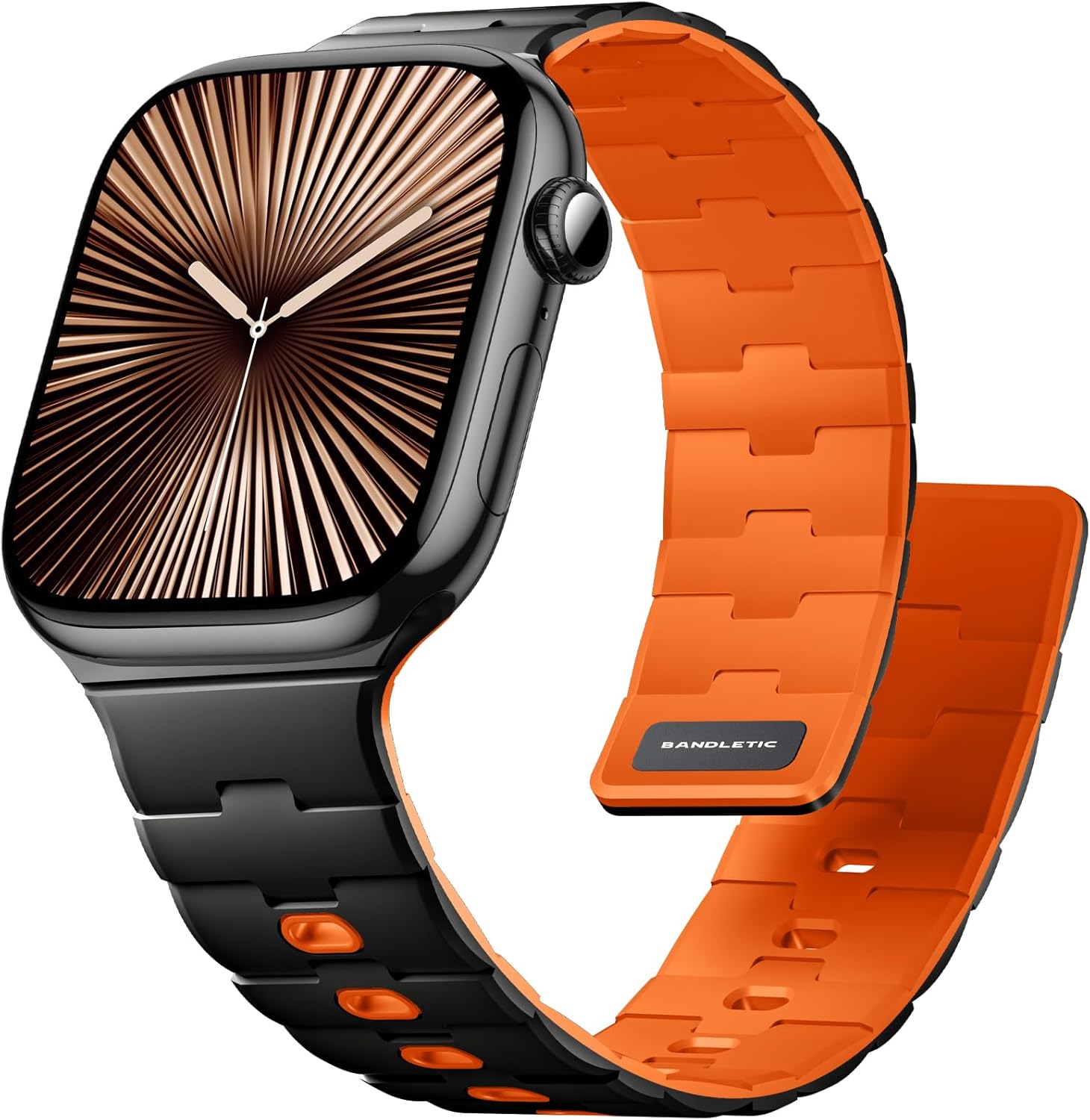 Confidence in Every Adventure The Bandletic Magnetic watchband redefines security and style for Apple Watch users. Engineered with N54 magnets and a pin-and-tuck closure, it locks firmly during trail runs, weightlifting, or outdoor hiking, yet feels barely-there for all-day office wear. Why Choose Us? For Outdoor Enthusiasts: Waterproof, dustproof, and sweat-resistant to withstand camping, swimming, or endurance training. For Professionals: Slim profile and dual-color options (e.g., Black/Orange for boldness, White/Pink for elegance) match business attire. For Gift Shoppers: Luxe packaging with a silicone magnetic loop band adds thoughtful value for birthdays, Father’s Day, or holidays. Technical Perfection Material: Upgraded silicone with UV coating to resist fading. Weight: 26g – lighter than most rubber silicone bands. Compatibilities: Compatible with apple watch bands for men magneticCompatible with apple watch series 11 bandCompatible with apple watch series 11 46mm band for womenCompatible with apple watch series se 3 bandCompatible with apple watch se 44mm band for womenCompatible with apple watch series 10 bandCompatible with apple watch series 10 46mm band Compatible with apple watch ultra magnetic band 49mm Compatible with apple watch magnetic link band 46mm Compatible with apple watch silicone magnetic band 45mm 44mm 42mm Compatible with apple watch correa para 49mm 46mm 45mm 44mm 42mm 41mm 40mm 38mm