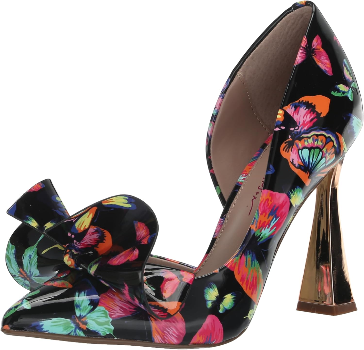 Betsey Johnson Nobble-P pumps come in a bright patent Black Butterfly pattern with a large sculpted bow and curved patent heel.