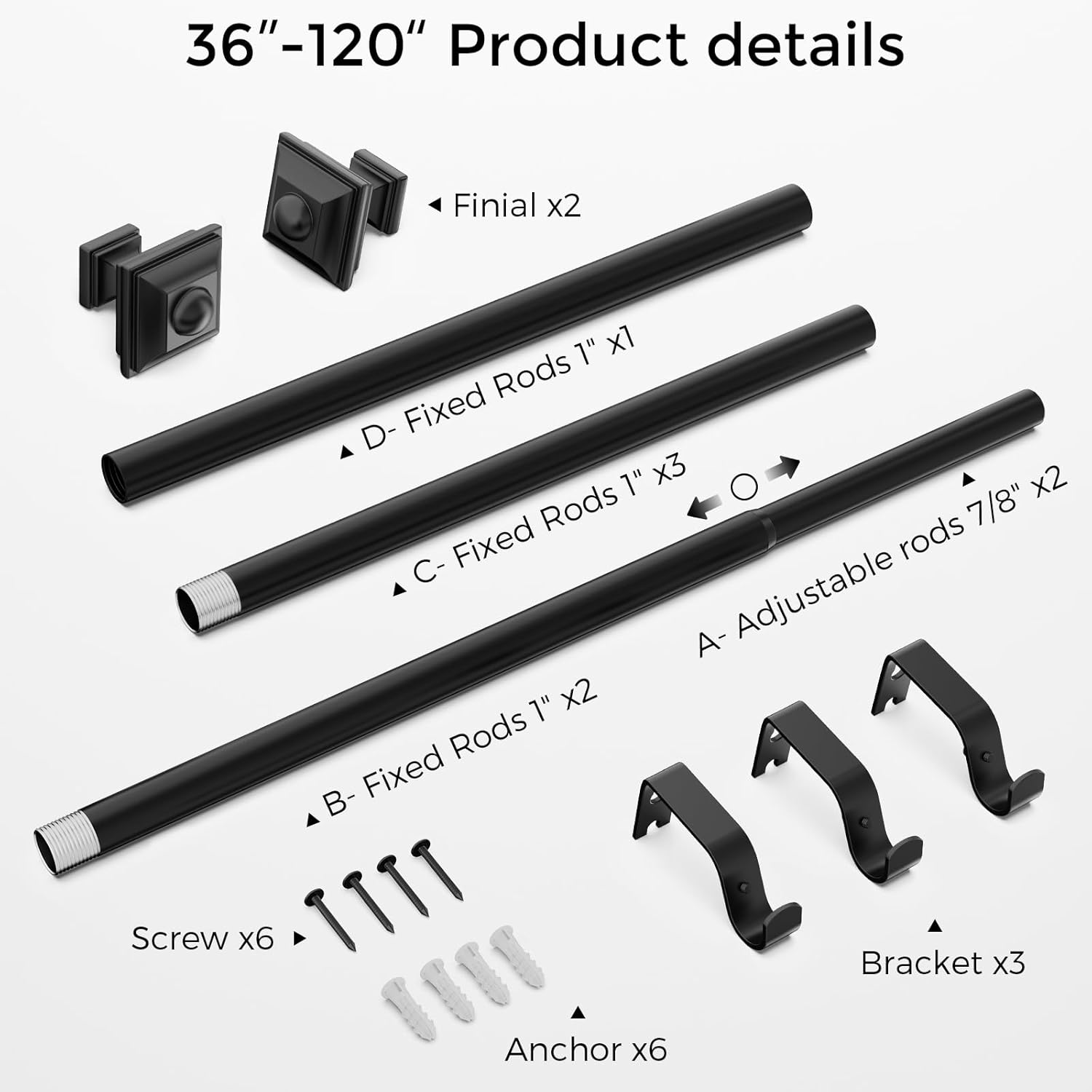 | Included Components | 2 x Finials, 2 × Connector, 3 x Brackets, 6 x 16" x 1"Rods&2 x 16" x 7/8"Rods, 6 x Anchors&6 x Screws |