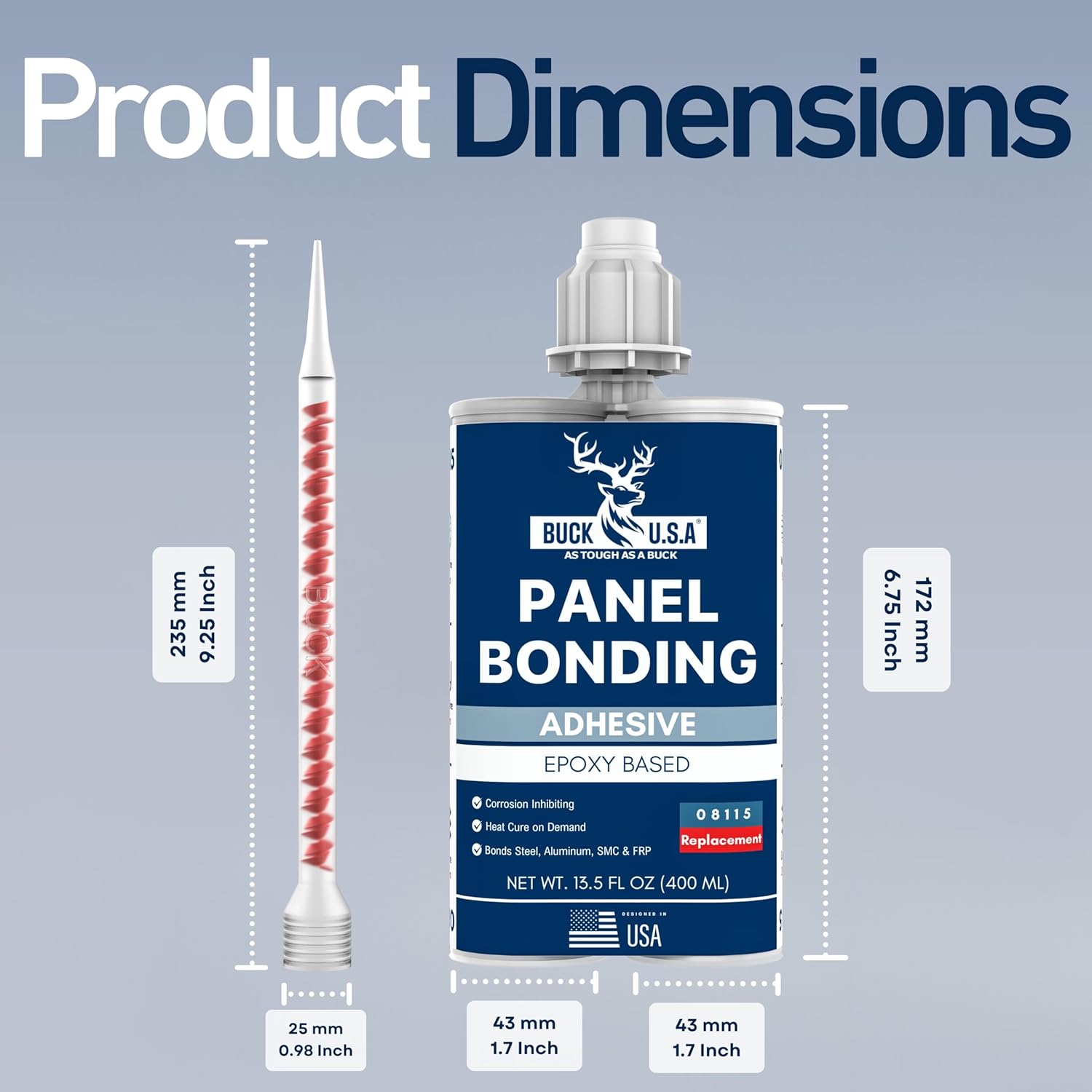 The Buck Panel Bonding Adhesive & Applicator Kit combines a professional 400ml two-part epoxy cartridge with a high-thrust dual cartridge epoxy gun to deliver clean, controlled dispensing and dependable bonding performance for automotive and structural repairs.This kit is designed for 400ml dual-component cartridges and supports both 1:1 and 2:1 mix ratios, making it compatible with a wide range of epoxy, urethane, and acrylic adhesives. Not compatible with 200ml cartridges.The included epoxy gun features a full-metal frame and reinforced steel push rods to handle thick panel bond and structural epoxies with smooth, consistent flow. An ergonomic, rubber-coated handle and quick-release lever help reduce fatigue and improve control during extended use.The two-part panel bonding epoxy is engineered for strong, vibration-resistant adhesion and is an ideal 08115 replacement for common auto body bonding tasks. It bonds reliably to steel, aluminum, plastic, fiberglass, and composite panels, cures effectively at room temperature, and is formulated to resist moisture, chemicals, and corrosion for durable, long-lasting repairs.Whether you’re bonding door skins, quarter panels, roof panels, or bumper covers, filling gaps, or completing plastic and fiberglass repairs, the Buck Panel Bonding Kit delivers a professional system built for consistent results.