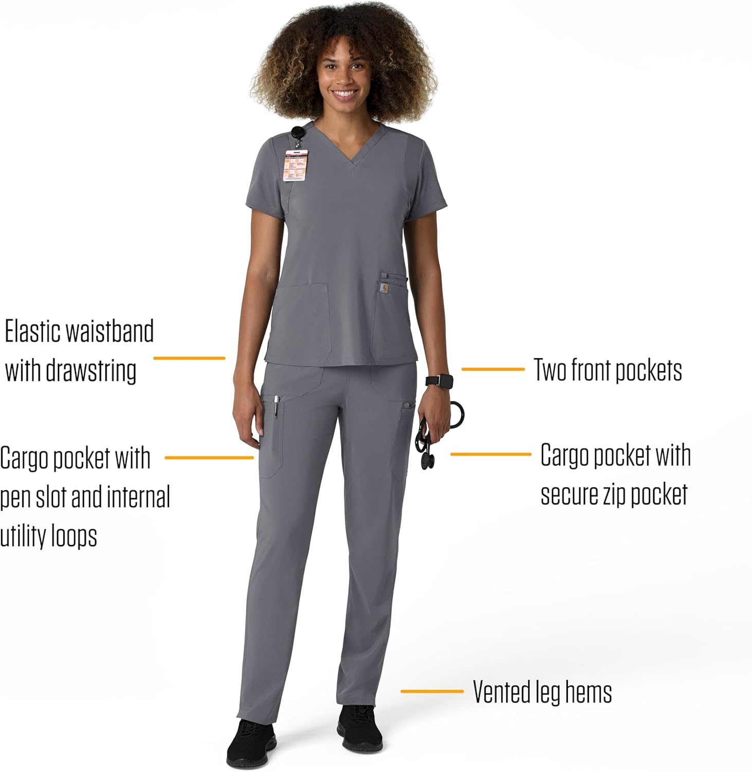 The Carhartt Force Cross-Flex Women's Straight Leg Cargo Scrub Pant – the perfect blend of durability, comfort, and style for healthcare professionals. These women's scrubs by Carhartt are designed to meet the demands of your busy workday while ensuring you look and feel your best. Crafted with the renowned Carhartt quality, these scrub pants are made from a high-performance fabric that stands up to the rigors of your profession. The Force Cross-Flex technology ensures flexibility and ease of movement, allowing you to navigate your day with comfort and confidence. The straight leg design offers a modern and flattering fit, while the cargo style adds functionality to your workwear. With multiple pockets, you can conveniently carry essential items, keeping everything you need within reach.