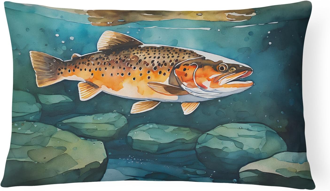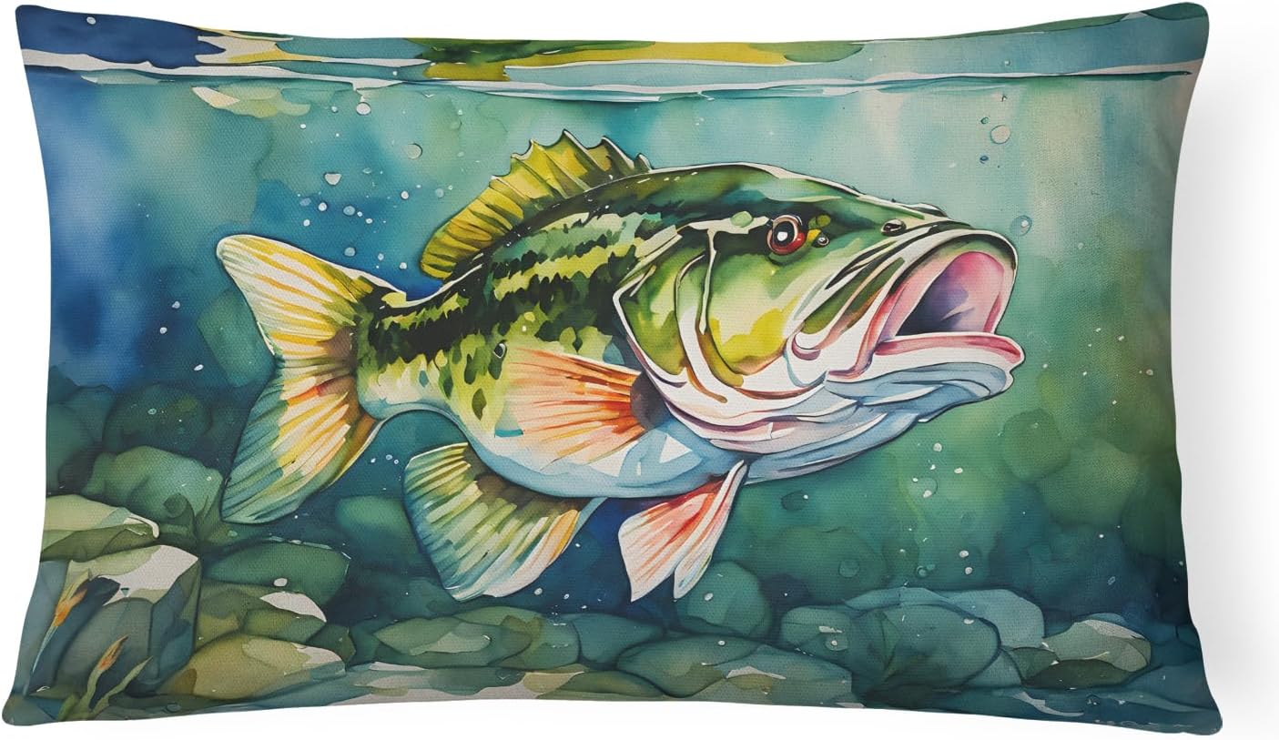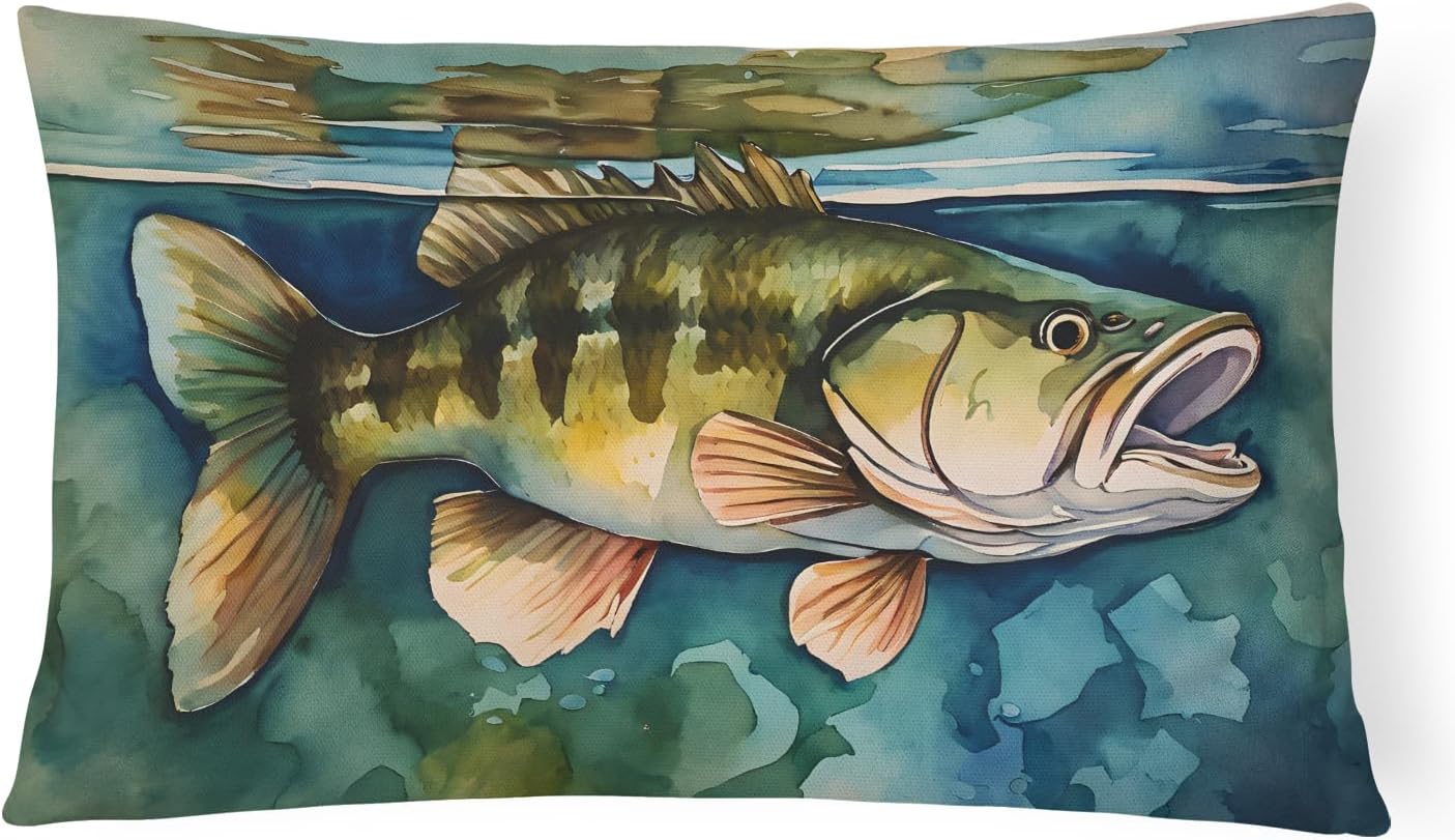 Throw Pillow featuring breed specific Largemouth Bass artwork. Revitalize your outdoor or indoor living space with Caroline's Treasures 18x18 Fabric Decorative Pillow. With a generously sized dimension of approximately 18 inches by 18 inches, this pillow makes a comfortable and aesthetic addition to any seating area. Made from a unique, water-resistant material developed by Caroline's Treasures, the pillow sham is 100% polyester fabric that's durable and ready to weather any condition. Its vibrant, full-color artwork will not fade over time as it is dyed with color-fast dyes. Whether you place it on your patio furniture, porch, veranda, or indoor couch, its soft canvas fabric ensures a cozy experience. The pillow is handcrafted in the United States, featuring a sham created from three pieces of fabric and a polyester insert for enduring shape and overstuffed comfort. Despite being robustly built to endure the outdoors, it is as soft and snug as your favorite indoor cushions. Please note, as all our pillows are handmade, sizes may vary slightly, adding to the charm of this unique decorative item.