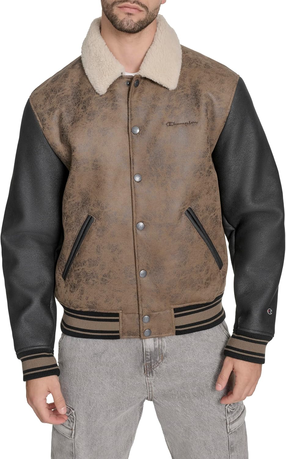 Elevate your streetwear style game with this fashion varsity bomber, featuring signature Champion patch logos throughout. The varsity rib knit collar, cuffs, and hem add a classic touch to this stylish, versatile piece perfect for any urban wardrobe.