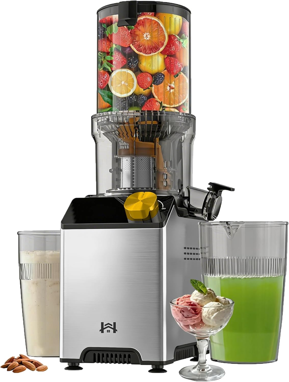 Introducing the WHUTO 4.35" Large Chute Stainless Steel Cold Press Juicer. This juicer machine features a 4.35-inch wide feeding chute, allowing you to put in whole fruits and vegetables without the need for pre-cutting—making your juicing process convenient and time-efficient. You can also use this juice extractor machine to create nut milk or ice cream, unlocking a variety of nutritious and delicious treats. Designed with safety in mind, this juice maker is equipped with a safety lock to prevent accidental injuries during operation, making it ideal for home use. Plus, the thoughtful details in its design enhance both durability and user experience. Cleaning is simple and quick—just three steps to disassemble and reassemble, with most parts being easy to rinse and dry. Enjoy fresh, healthy juice with ease using the WHUTO cold press juicer machines!