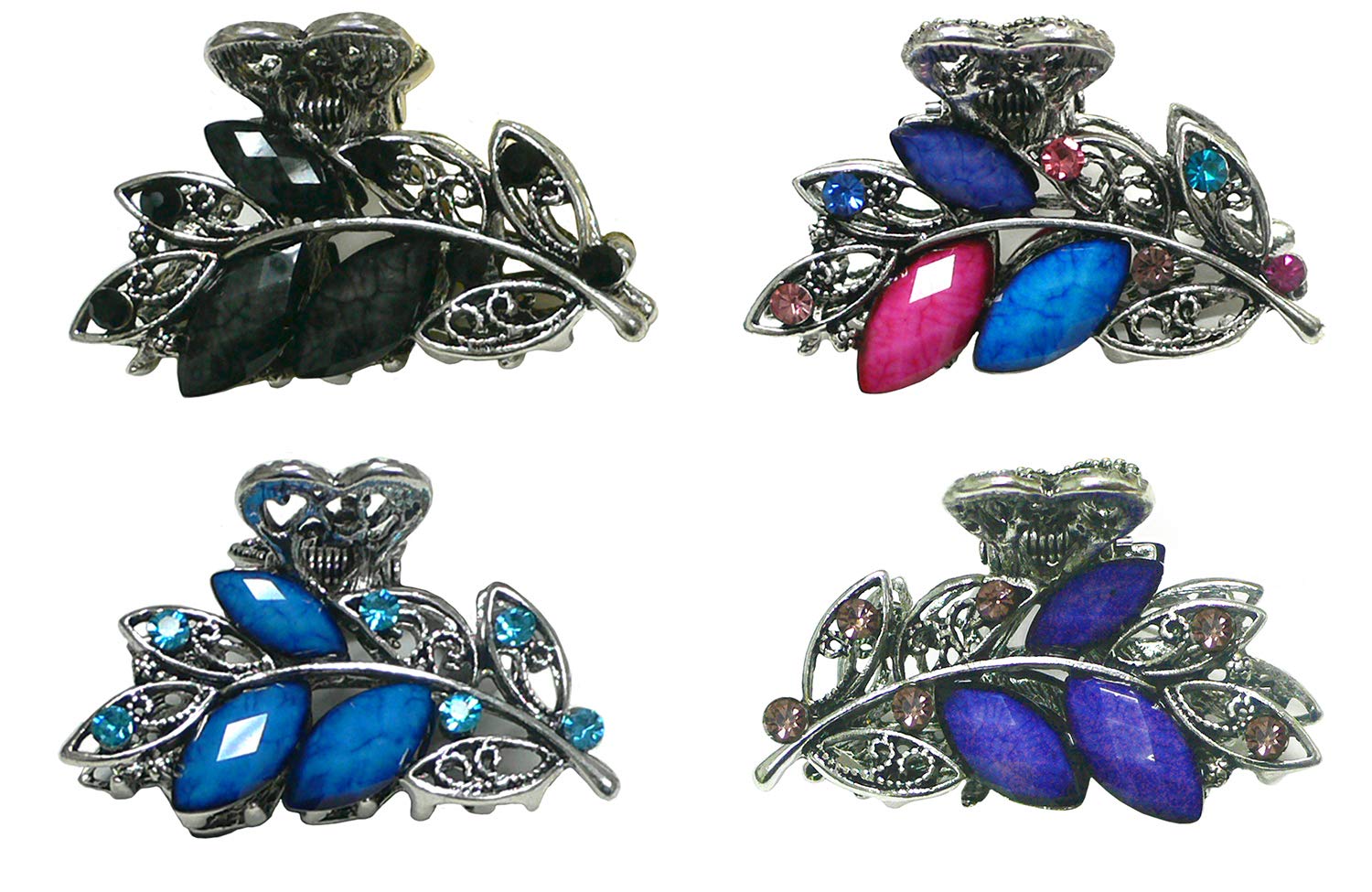 Combo Set of 6 small metal claw clips, in 2 styles, decorated with colorful beads and sparkly crystals, 1 each of 6 colors. Size is approx. 2.13" x 1.63". Ideal for styling hair into a hair twist or hair bun