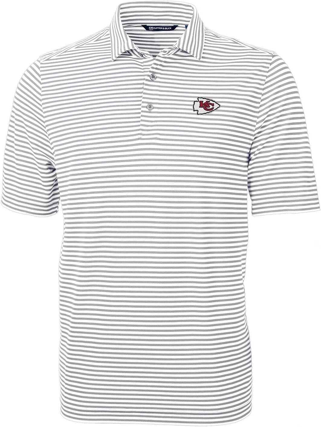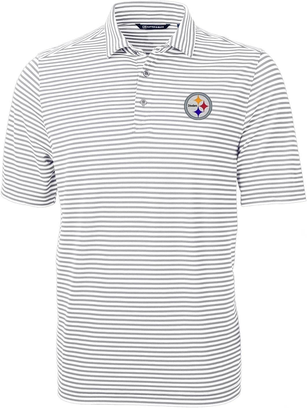 The Men's Cutter & Buck Gray team Virtue Eco Pique Stripe Recycled Polo is a sustainable and stylish choice for any Steelers fan. Crafted from recycled plastic bottles, this polo is eco-friendly and comfortable to wear. Its moisture-wicking fabric keeps you cool and dry, while the UPF 25+ UV Sun Protection shields you from the sun's harmful rays. Printed graphics and CB logo trims add a touch of team spirit, making this polo the perfect way to show your support for the team.