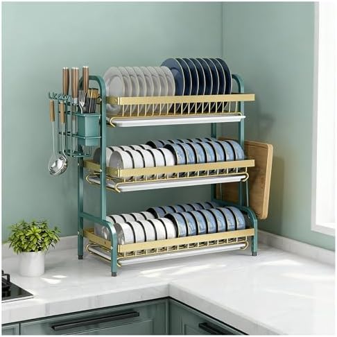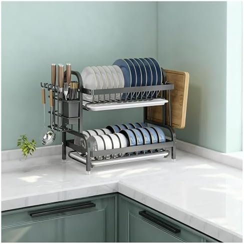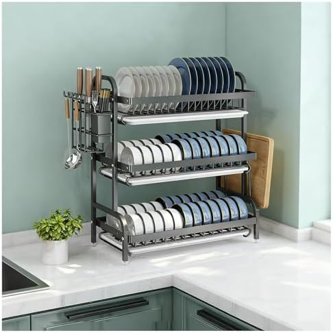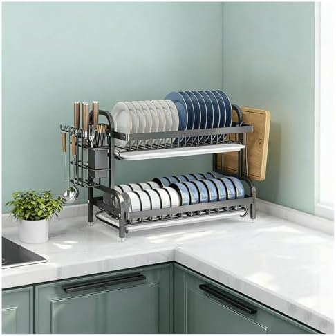Dish Rack: The Ultimate Blend of Portability and Functionality Experience unparalleled convenience with the Dish Rack, engineered to be lightweight and effortlessly movable. This makes it the ideal choice for anyone who needs a versatile dish drying solution that can adapt to different spaces in their home with ease. Key Features: -- "R" Shaped Sturdy Design: The innovative "R" shaped structure of this dish rack provides exceptional stability and balance. You can trust it to securely hold all your dishes, preventing any risk of tipping over, even when fully loaded. -- Triple Drip Trays for a Clean Countertop: Say goodbye to messy countertops! This dish drying rack comes equipped with three drip trays that efficiently collect water dripping from your dishes, keeping your kitchen surfaces clean and dry. -- 2/3-Tier Versatile Storage: Maximize your drying space with the 2/3-Tier design, perfect for accommodating a variety of kitchenware including bowls, plates, small pots, and seasoning bottles. Durable Metal Construction: Built to last, this dish rack is crafted from high-quality metal, ensuring it can withstand daily use while maintaining its sleek appearance. Upgrade your kitchen routine with the Dish Rack—where lightweight portability meets robust functionality for a cleaner, more organized kitchen space!