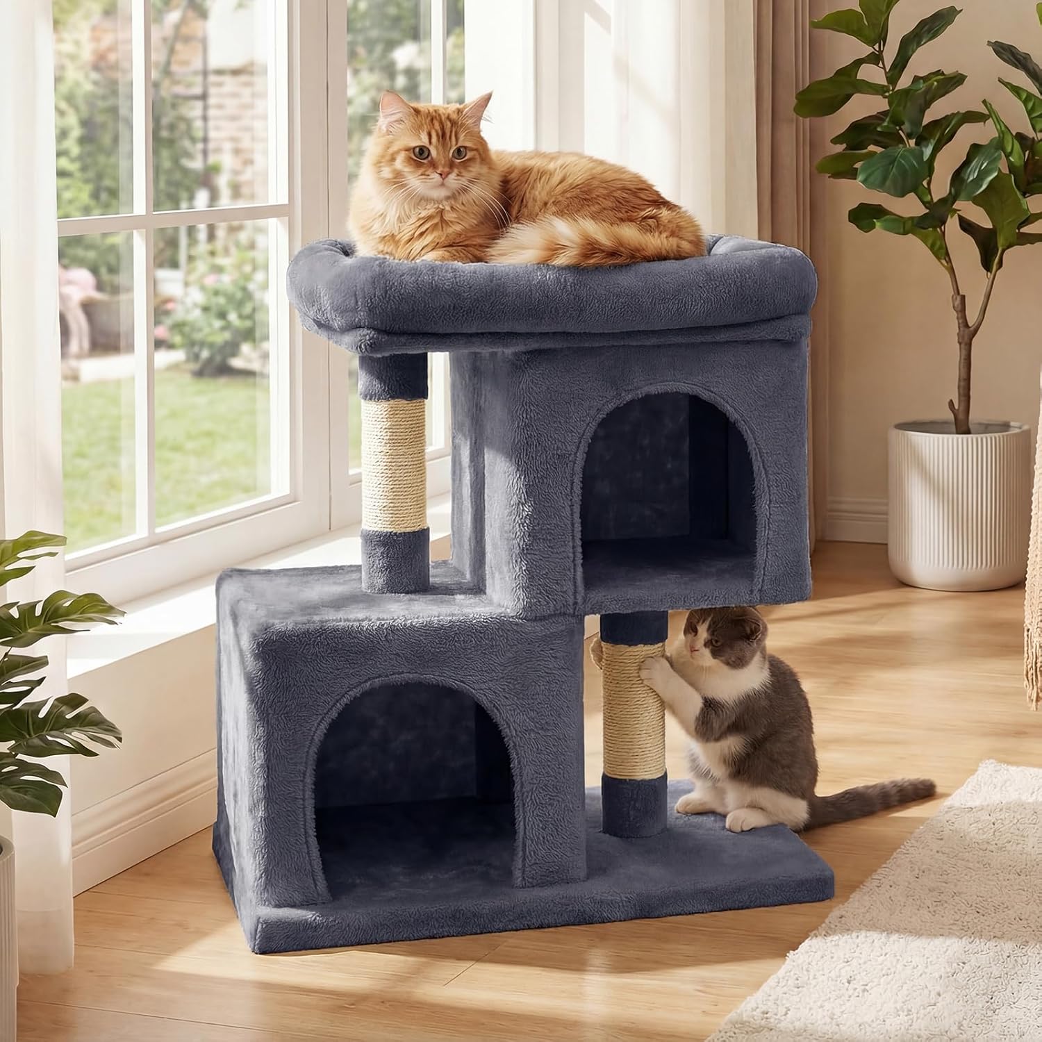Description:Improve your cats' playtime with the cat tower.The large perch of the cat playhouse provides a cozy and elevated spot for your feline friends to keep watch over their surroundings, which is filled with soft PP cotton and for a supportive lounge. Plus, 2 condos with 3 caves are perfect for cats who love to hide and rest. Plus, wear-resistant sisal-wrapped scratching posts satisfy natural clawing instincts and help protect your furniture from scratches. Built for stability and peace of mind, the cat tree features an extra-wide base and includes an anti-tipping device, ensuring it stays securely in place during energetic play. Covered with soft plush fabric, the modern cat tree creates a safe, welcoming haven your pets will love.Features:Large perch bed offers a cozy and secure spot for cats to observe the surroundings2 spacious condos reduce territorial disputes in multi-cat householdsSoft PP cotton & plush makes the perch supportive and skin-friendlySisal scratching post stimulates cats to sharpen claws and protects your furnitureNot easy to wobble or tip over with an anti-tipping deviceExtra wide base promises improved stability3 entrances offer easy access for furry friendsAssembly is requiredSpecifications:Color: Beige/Light Gray/Dark Gray/PinkMaterial: Engineered Board, Sisal, Plush Fabric, PP PolyesterOverall Height: 25.5"/65 cmBase Size: 24" x 16"/60 x 24 cm (L x W x H)Condo Size: 13.5" x 13.5" x 11"/34 x 34 x 27.5 cm (L x W x H)Perch Size: 19" x 16"/48 x 40 cm (L x H)Each Tier Maximum Weight: 22 lbs/10 kgNet Weight: 18 lbs/8 kg