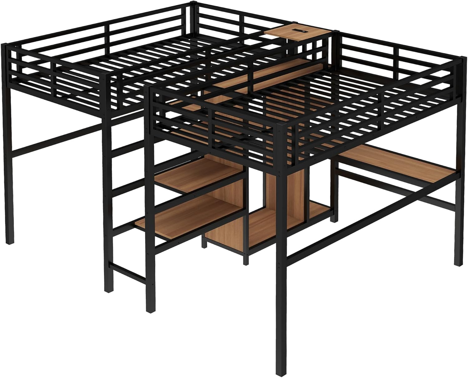 This loft bed features a convenient built-in desk, ideal for work or study. It includes dual power outlets—one on the desk and another on the bunk—keeping your electronic devices charged and within easy reach. With thoughtfully designed shelves conveniently located under the stairs, this loft bed offers ample storage space to keep your belongings organized while efficiently utilizing your room. The layout of the loft bed can easily be adapted into two independent areas. This design caters not just to your sleep needs but also provides a dedicated personal space for work or relaxation. Experience a streamlined and productive environment with this loft bed set-up, which creates an effective space for studying, working, or enjoying leisure activities without distractions. Perfect for smaller rooms or shared spaces, this loft bed combines style and functionality, enhancing your room's aesthetic while saving valuable floor space. Details Product Type: Metal Loft Bed Size: Twin/Twin Product Material: Metal Overall Product Dimension: 99.4"L x 78"W x 66"H Overall Product Weight: 196.43LBS Weight Capacity: 350 lb. load capacity for beds, 150 lb. load capacity for desks, 150 lb. load capacity for side stair shelves Recommended Mattress Thickness: Upper bed mattress size 6″ Box Spring Required: No Assembly Required: Yes