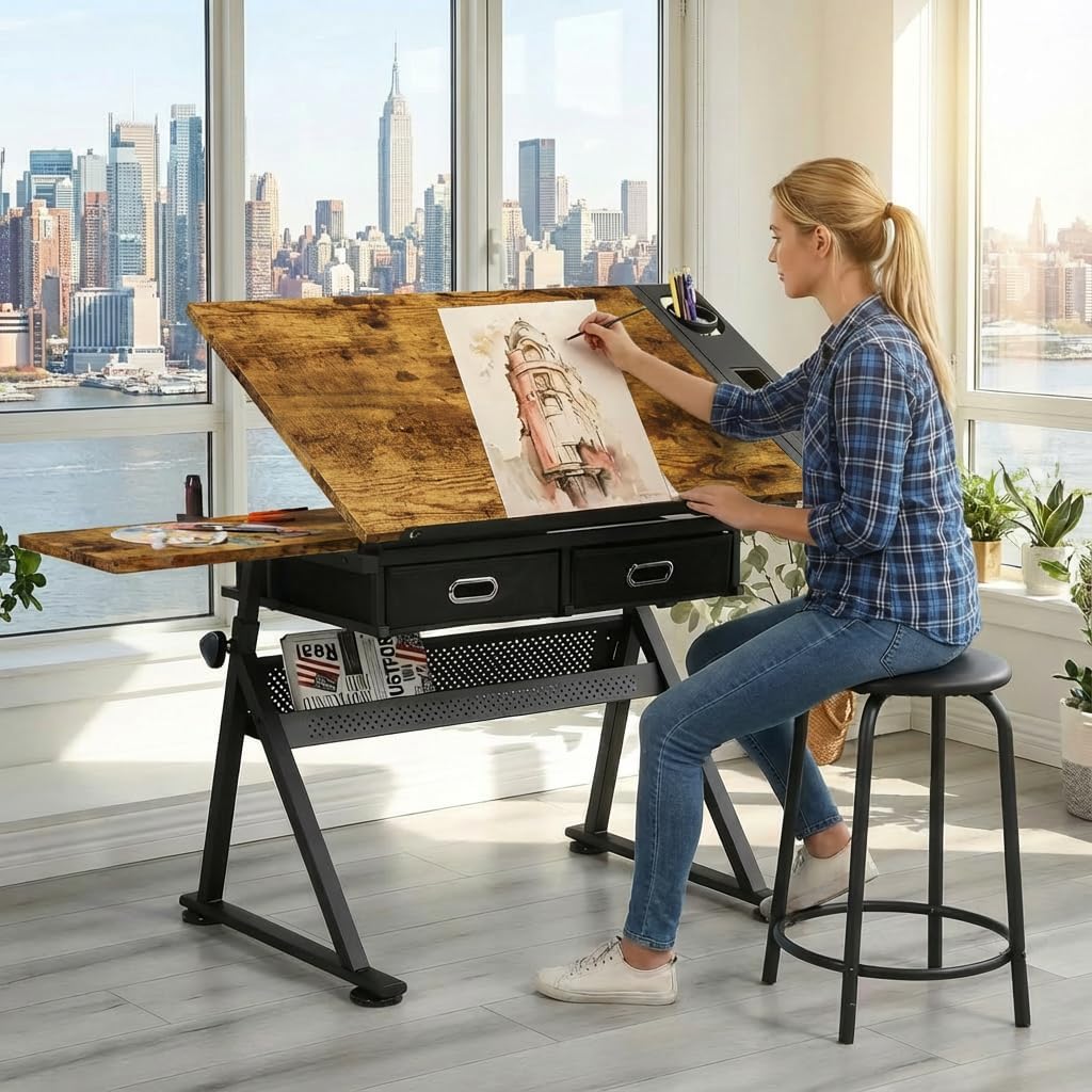 • Art Desk with Ample Storage: Includes two large fabric drawers for organized storage of art supplies, tools, and documents, helping you maintain a clutter-free workspace