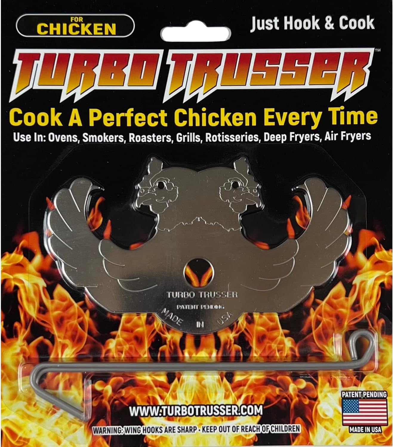 Now you can make a perfectly cooked Cornish Hen, thanks to the Turbo Trusser! Stop wasting time using butchers’ twine that is difficult to tie, and simply truss your poultry with this easy-to-use, stainless steel, and dishwasher safe Turbo Trusser. It will cook your chicken more evenly, create juicier meat, and will prevent your stuffing from drying out. Use in ovens, grills, smokers, roasters, rotisseries, air fryers and deep fryers. No more worrying about if your bird will turn out, this Turbo Trusser works every time! As seen on Shark Tank and made in the USA. HOW TO USE: Attach each end of both hooks through the small holes at the top of the Turbo Trusser. Then place the Turbo Trusser right-side-up and push the legs of the bird down through the openings on each side of the trusser. Finally, pierce each hook into each wing of the bird, and it’s ready to cook!
