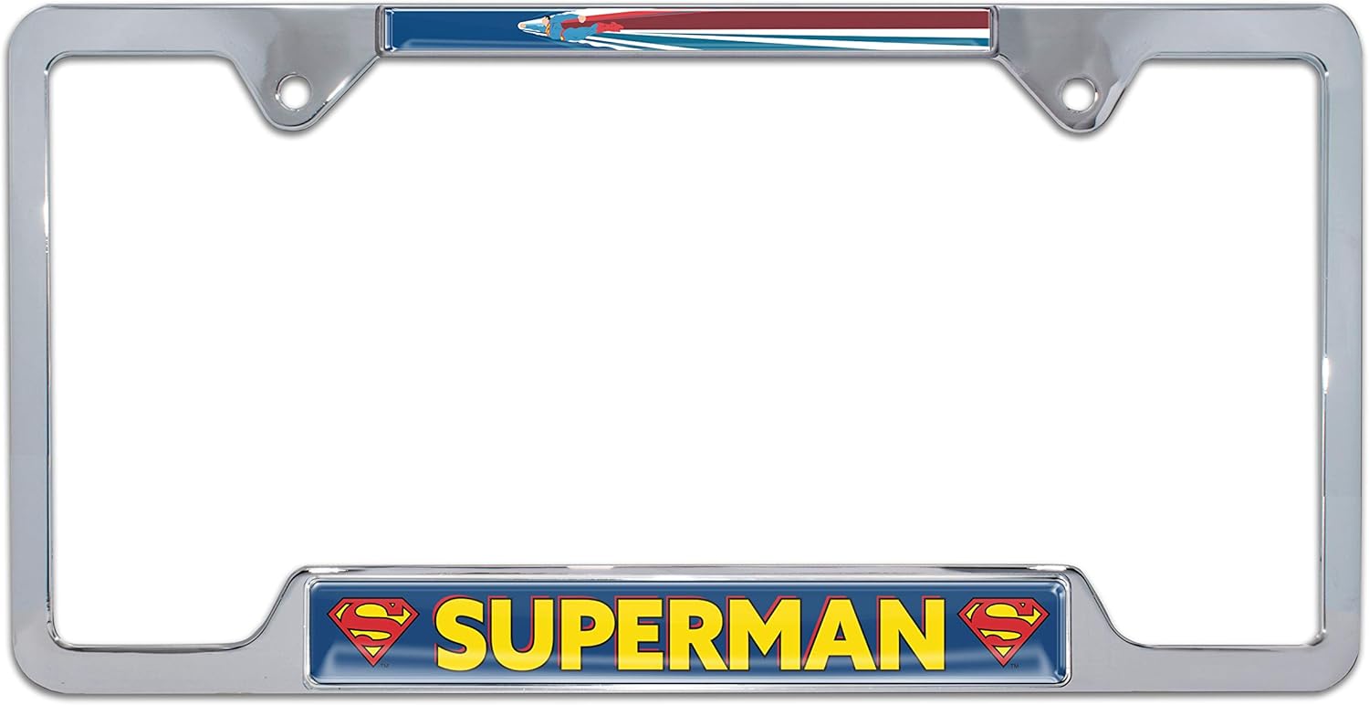 Elevate your vehicle’s style with this Officially Licensed DC Comics Superman Distressed Graphic chrome-plated metal license plate frame by Elektroplate. This high-quality all-metal frame is built to endure the elements, ensuring it remains looking brand new for years without chipping or fading. The frame features Made in the USA graphic inserts with 3D doming, vivid colors, and UV protection. Our high-end license plate frames are the perfect way to showcase your favorite superhero everywhere you drive. This standard size tag holder frame contains a full bottom bar of graphics and is ideal for states that require registration tags or stickers on the upper corners of the license plate, or for states that do not require tags on license plates. These states include AL, AK, AZ, AR, CA, CT, FL, HI, IL, KS, MD, MA, MI, MO, MT, NE, NV, NH, NJ, NY, OK, PA, TX, UT, VA, WA. Designed to fit 12" x 6" standard license plates.