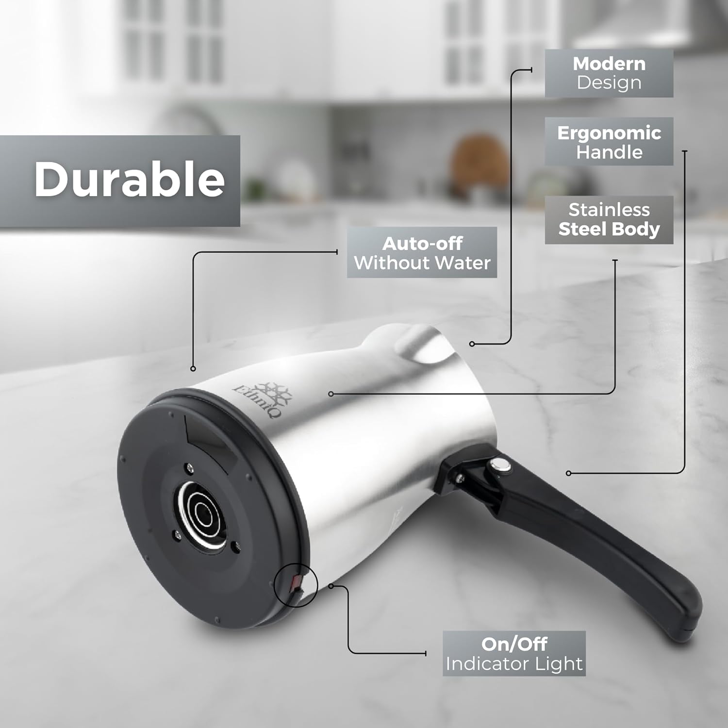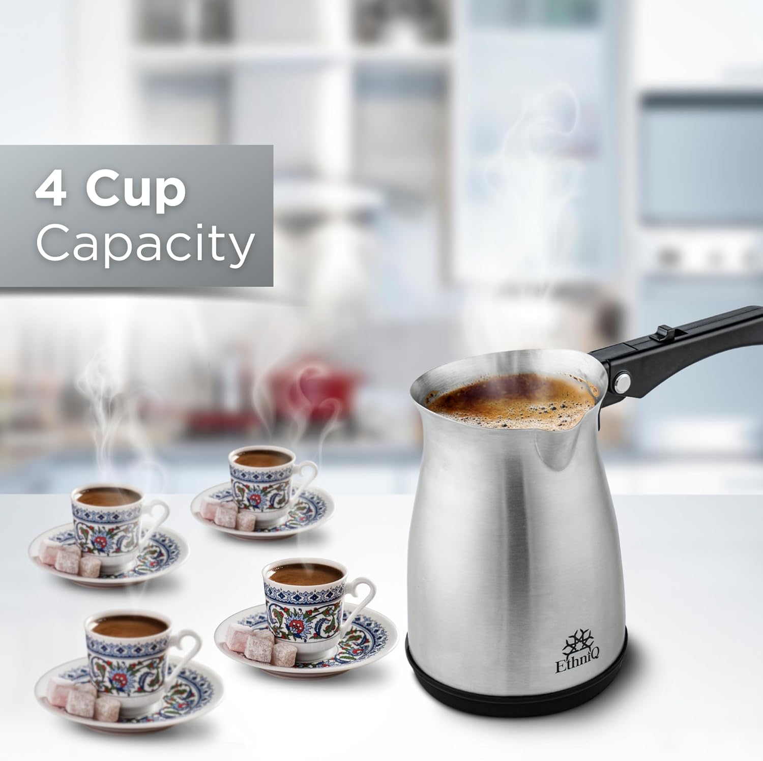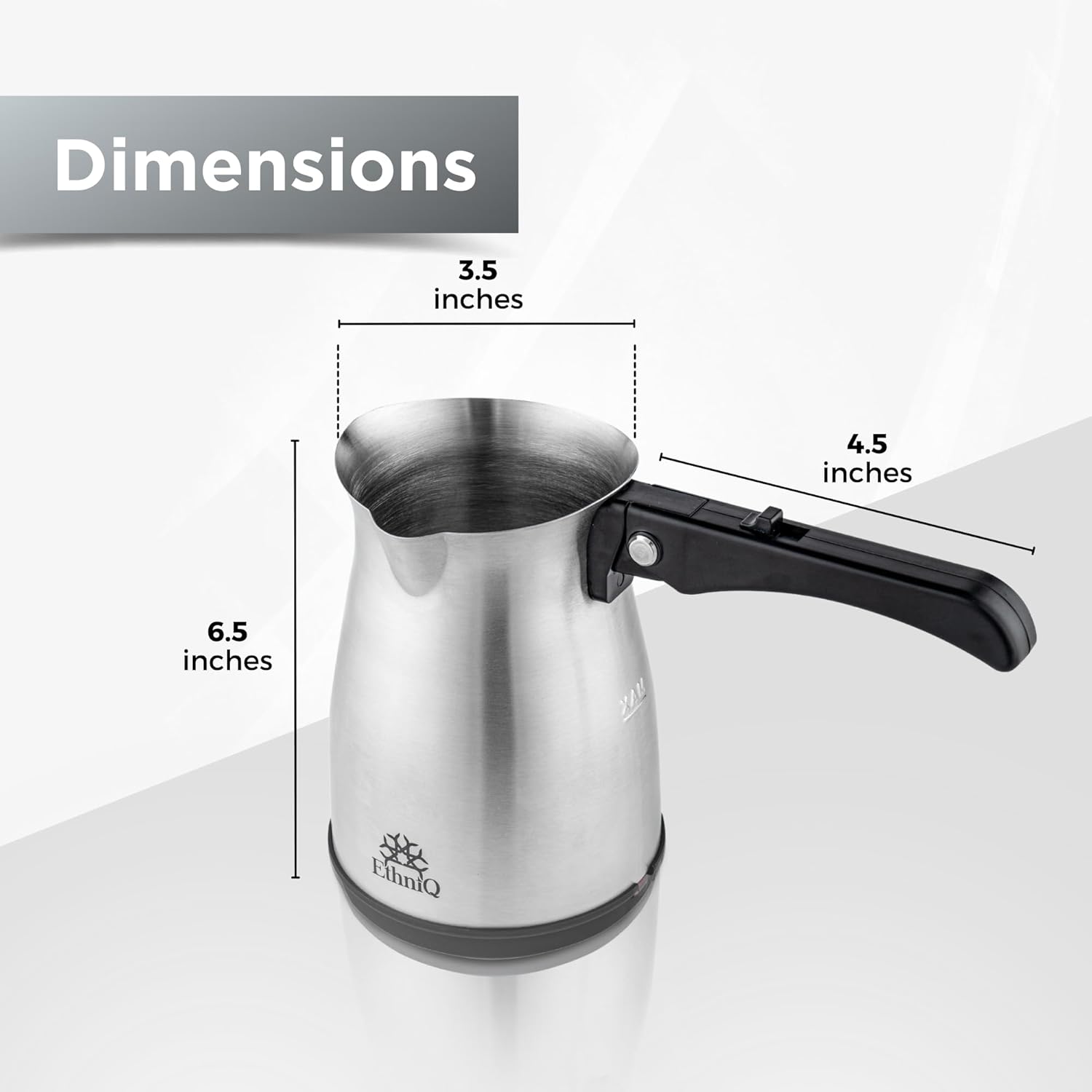 ETHNIQ STAINLESS STEEL TURKISH COFFEE POT - QUICK BREWExperience the art of coffee brewing at its finest with the EthniQ Turkish Coffee Pot. Elevate your home coffee ritual with our innovative solution that seamlessly marries tradition with cutting-edge technology. Crafted by experts, our Turkish Coffee Pot is not just a machine; it's a commitment to exceptional brewing experiences.Durable and Easy to Clean: EthniQ Turkish Coffee Pot is built for enduring performance. Its sturdy construction ensures longevity, while the easy-to-clean design allows you to savor cup after cup of Turkish, Arabic, or Greek coffee without any hassle.Start Your Day with Intensity: Kickstart your mornings with energy and flavors that awaken your senses. Our electric Turkish coffee maker effortlessly brews authentic Turkish, Greek, and Arabic coffee, delivering an intense aroma and delightful taste that sets the tone for a vibrant day.Multi-Purpose & User-Friendly: Beyond its remarkable coffee-making capabilities, our Turkish Coffee Pot is versatile. With one-button on/off functionality and a fast-heating feature, it ensures a hassle-free brewing process. The easy-grip handle facilitates smooth pouring, and its multi-functionality allows you to brew tea and boil water, making it a Turkish coffee pot and a kettle warmer in one.Features & Specifications:Capacity: 0.3 Liters / 4 Cups of CoffeePremium Quality Stainless SteelFoldable Handle for PortabilityCordless Base for Convenient OperationQuality and Service Excellence: At EthniQ, quality and service are our top priorities. We are confident that our Turkish Coffee Pot will exceed your expectations. In the rare event that you're not satisfied, we offer a hassle-free return policy for a full refund. Contact us anytime; we are here to assist you in making your coffee experience exceptional!