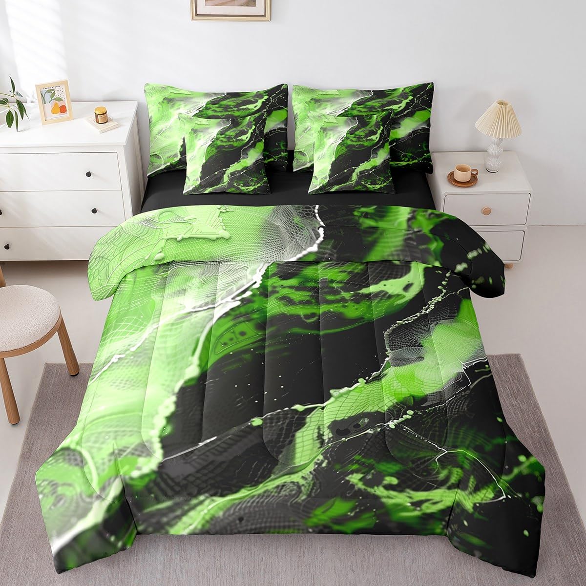 Why choose us Everyone has their own preferences; we develop different styles and different designs to suit the hobbies and aesthetics of different people; we look forward to bringing more joy and fun into your life; special design for special you; it's not just a simple home product, it's a way of life Brighten up your bedroom with this bed linen set; this bright and colourful bedding set features vibrant colours and special print pattern; turn the reversible duvet set over for a new look against a modern geometric background Convenient to use due to polyester which is super soft and comfortable; this all year round bedding is designed to be lightweight and breathable for a good night's sleep; a practical product for homes, dormitories, hotels, guest rooms Twin bedding set includes 1 twin comforter: 68"x90", 1 fitted sheet: 39"x75"x16", 1 flat sheet: 66"x96", 2 Pillowcases: 20"x30", 2 square pillow covers: 18"x18", perfect for a twin size bed. Full bedding set includes 1 full comforter: 79"x90", 1 fitted sheet: 54"x75"x16", 1 flat sheet: 81"x96", 2 Pillowcases: 20"x30", 2 square pillow covers: 18"x18", perfect for a full size bed. Queen bedding set includes 1 queen comforter: 90"x90", 1 fitted sheet: 60"x80"x16", 1 flat sheet: 90"x102", 2 Pillowcases: 20"x30", 2 square pillow covers: 18"x18", perfect for a queen size bed. King bedding set includes 1 king comforter: 104"x90", 1 fitted sheet: 78"x80"x16", 1 flat sheet: 90"x106", 2 Pillowcases: 20"x36", 2 square pillow covers: 18"x18", perfect for a king size bed. In addition to this comforter set with sheets, there are curtains, area rugs, shower curtains, blankets and other furniture with the same design waiting for you to explore. Whether it is for birthday of your family or friends, relatives, or just for yourself, the item should be interesting and authentic.