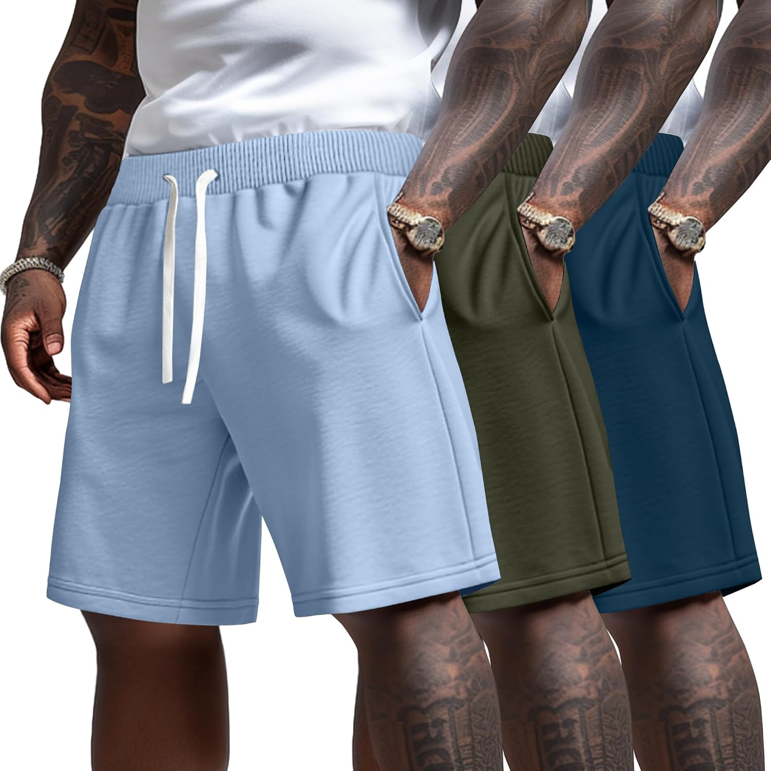 Men's athletic shorts are equipped with 3 pockets, 2 on the sides and 1 at the back, you can have peace of mind knowing your keys and phone are securely held within. With deep pockets that provide functional storage, you don't have to worry about your items falling out whether you're doing your daily gym routine or having fun Men's sweat shorts, men's cotton shorts, athletic shorts, fitness Shorts, or men's sleeping shorts. Our men's shorts with drawstring look very simple, about knee-length, lounging to wear ensuring comfort without compromising style, making it an ideal choice for everyday wear and outdoors Elastic waistband with drawstring: Our men's sports shorts have an elastic waistband with an adjustable drawstring, making the men's casual cotton shorts incredibly comfortable to wear throughout the day. The elastic waistband is designed for flexibility, featuring an adjustable drawstring. The drawstring design makes it easier to put on and take off allowing for a custom fit of your waist Versatile color: The plain color makes these men's workout shorts versatile, giving people a clean and simple visual effect, which is suitable for those who like simple style, making the overall look neater and easily paired with various styles and colors top for a fashionable summer look Specification: Material: 80% Polyester, 15% Cotton, 5% Spandex Package Includes: 3 x casual shorts for men Notes: Manual measurement, please allow slight errors in size The colors may vary slightly due to different screen displays Hand wash in cold water or machine wash on a gentle cycle, hang or line dry, and do not bleach Please check the size chart before ordering