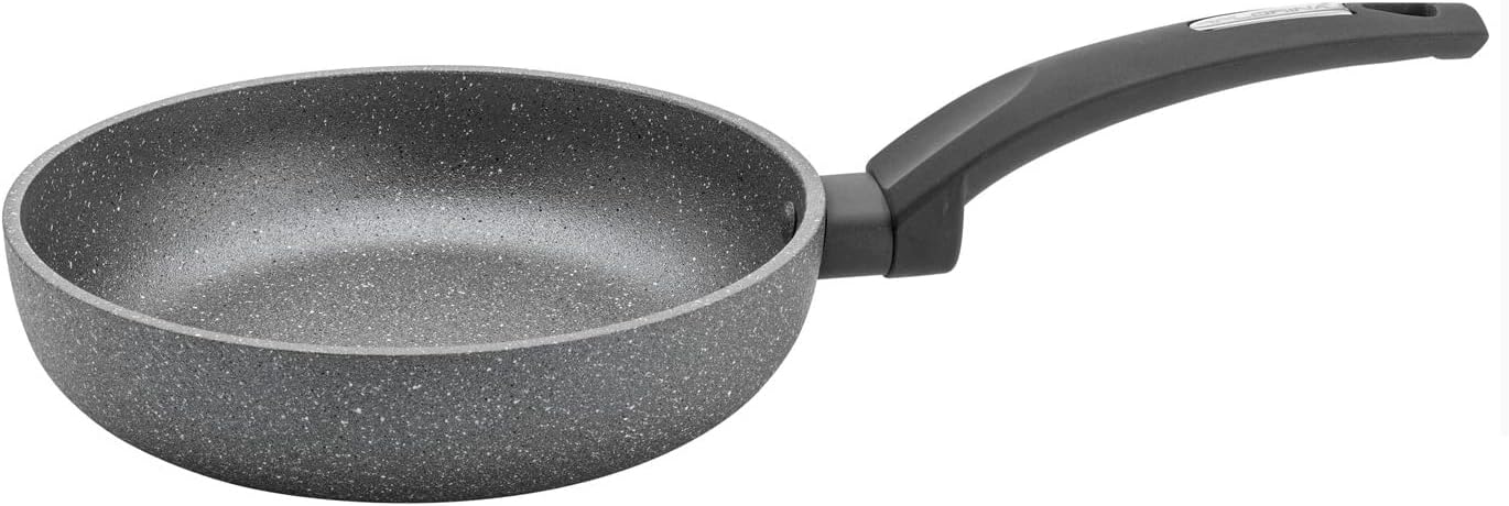 The durable Lava Stone pan with stone coating is scratch-proof - in the truest sense of the word! Can be used on any stove, including induction hobs. Covered with 5 layers of stone material - durable and scratch resistant. To mix the ingredients, you can use any accessory, even made of metal, without fear of damage. The coating of the Lava Stone frying pan has non-stick properties that reduce the use of grease. The handle is covered with a non-warming soft-touch material and sits comfortably in the hand. The pan is extremely easy to clean, so you will forget to scrub the cookware once and for all. Suitable for all heat sources, including induction hobs.