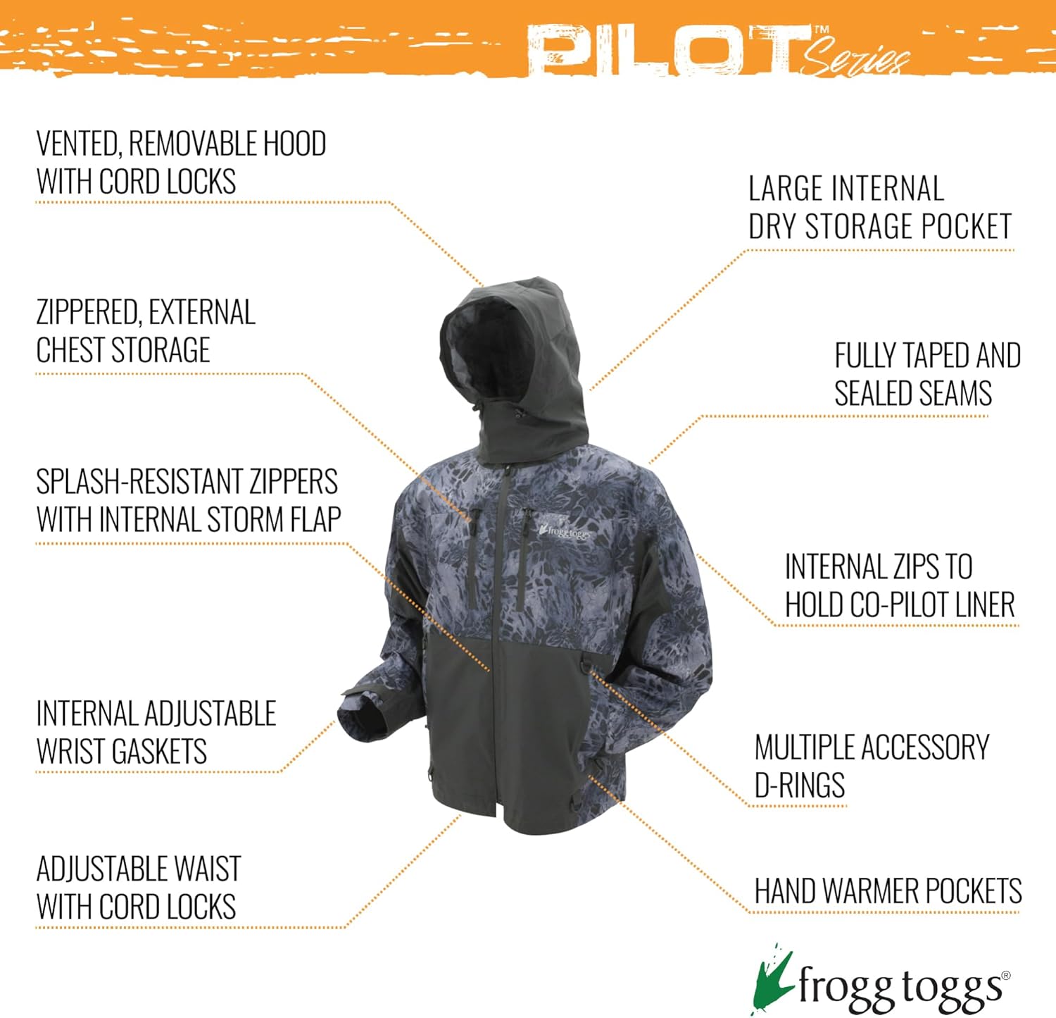 The Frogg Toggs Pilot II Guide rain jacket, crafted with a waterproof DriPore Gen2 fabric layer, provides exceptional water resistance and breathability. It's packed with features, making it ultra-flexible and perfect for outdoor adventures. A vented, removable hood with cord locks offers ample wind and rain protection; splash-resistant zippers and a water-resistant internal storm flap ensure air circulation for comfort; a shock cord adjustable waist with barrel locks guarantees a secure, comfortable fit. Additionally, it includes internal zips to accommodate the Co-Pilot liner for extra warmth in cold temperatures.