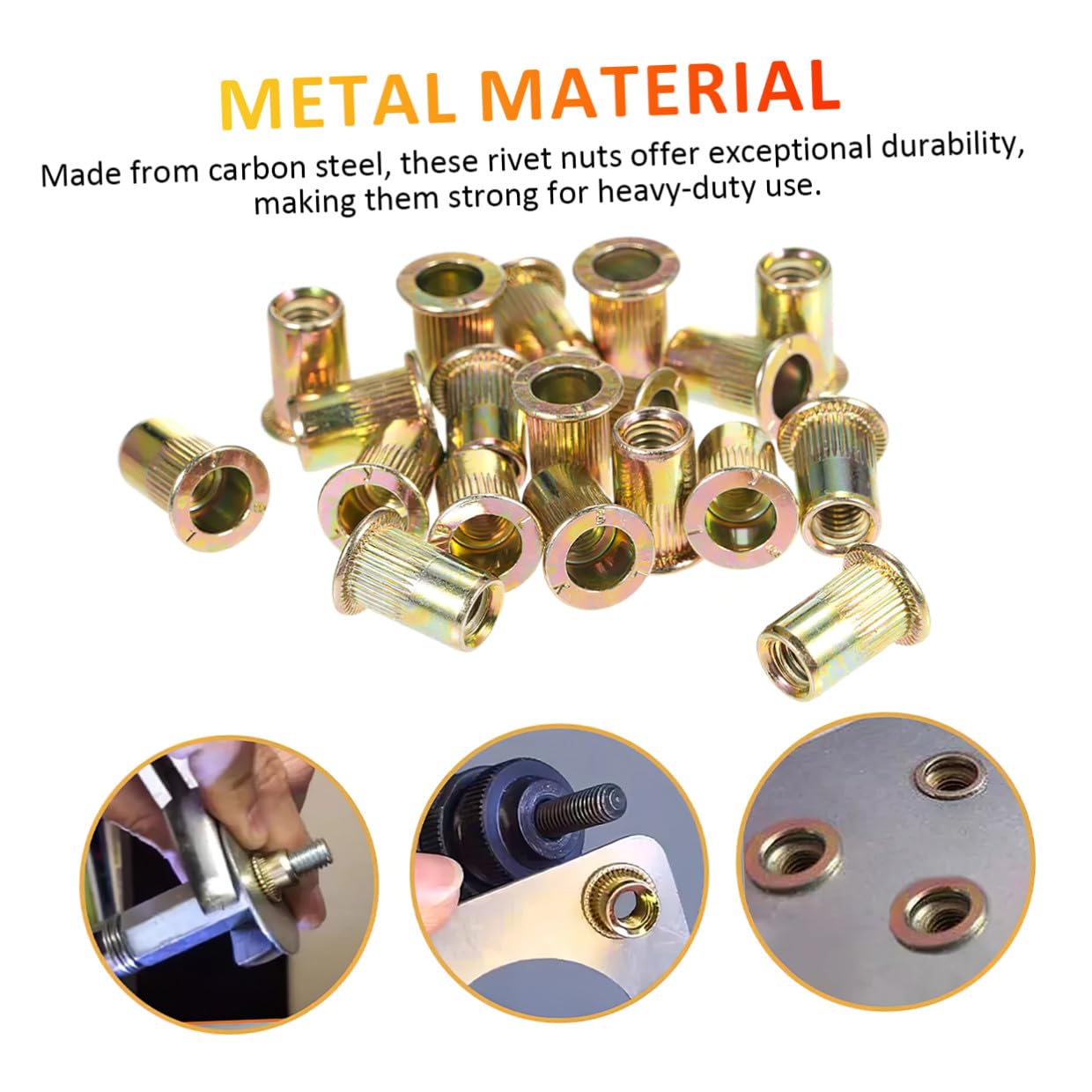 Package Include 150 x rivet nuts(M3) 150 x rivet nuts(M4) 100 x rivet nuts(M5) 60 x rivet nuts(M6) 30 x rivet nuts(M8) 10 x rivet nuts(M10) Characteristics -Size: 19.50X13.00X3.50cm/7.66X5.11X1.38in - Multiple Specifications: This rivet nut includes a variety of commonly used sizes, ensuring that you have the suitable rivet nut for different applications - Convenient Usage: The rivet nut comes in a box, making it easy to store and carry, ensuring that you can quickly access and use the nuts whenever needed threaded rivets -Material:Galvanized Carbon Steel -Product Info:Carbon steel press-ripper nut - Versatile Applications: Suitable for mechanical equipment and furniture assembly, these rivet nuts are widely used in both industrial and household settings rivet nut ribbing -Specifications: M3 M4 M5 M6 M8 M10 metal nut rivets - Metal Material: Made from carbon steel, these rivet nuts offer exceptional durability, making them strong for heavy-duty use - Bulk Supply: Each box contains a large quantity of rivet nuts, meeting high-volume demands and providing enough supply for long-term use hardware nuts -Color:GoldenGoods Informationcarbon steel nut inserts Introducing Steel Rivet Nut Assortment Kit, the great solution for all your fastening needs.Nut Inserts With a wide variety of sizes, this kit includes all the commonly used specifications for different requirements.Carbon Steel Rivet Nuts These rivet nuts offer exceptional strength and durability for use