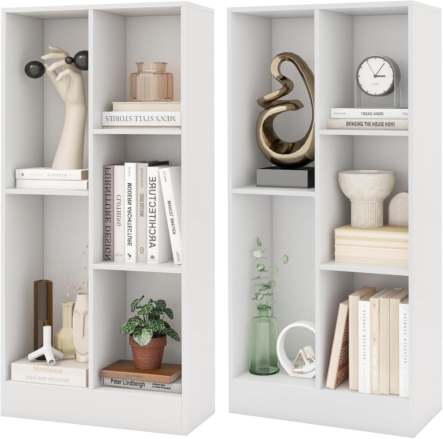 Description:Discover the ultimate storage solution with our freestanding display shelf!With 5 spacious compartments in 2 sizes, this open bookcase is perfect for organizing various items. In addition, it is equipped with anti-toppling kits for safety, while the non-slip foot pads and thick base bring added safety. Made to last, this multi-tier bookshelf can hold up to 220 lbs for peace of mind. With elegant look, it matches and complements your space.Features:5 compartments and spacious top for large storage capacity2 anti-tipping devices for exceptional stability and safetyOpen storage design makes items easily accessibleDesigned with stable base and non-slip foot padsSelected materials for long-lasting constructionApplicable to bedroom, study, living room and moreSmooth and easy-to-clean surface for quick maintenanceSpecifications:Color: Natural/WhiteMaterial: Engineered Wood, MDFOverall Dimensions: 19.5" x 9.5" x 41" (L x W x H)Dimension of Large Cube: 9" x 9" x 18" (L x W x H)Dimension of Small Cube: 9" x 9" x 12" (L x W x H)Height of Bottom Base: 3.5"Net Weight: 25 lbsWeight Capacity of Top: 88 lbsWeight Capacity of Each Cube: 22 lbsTotal Weight Capacity: 200 lbs