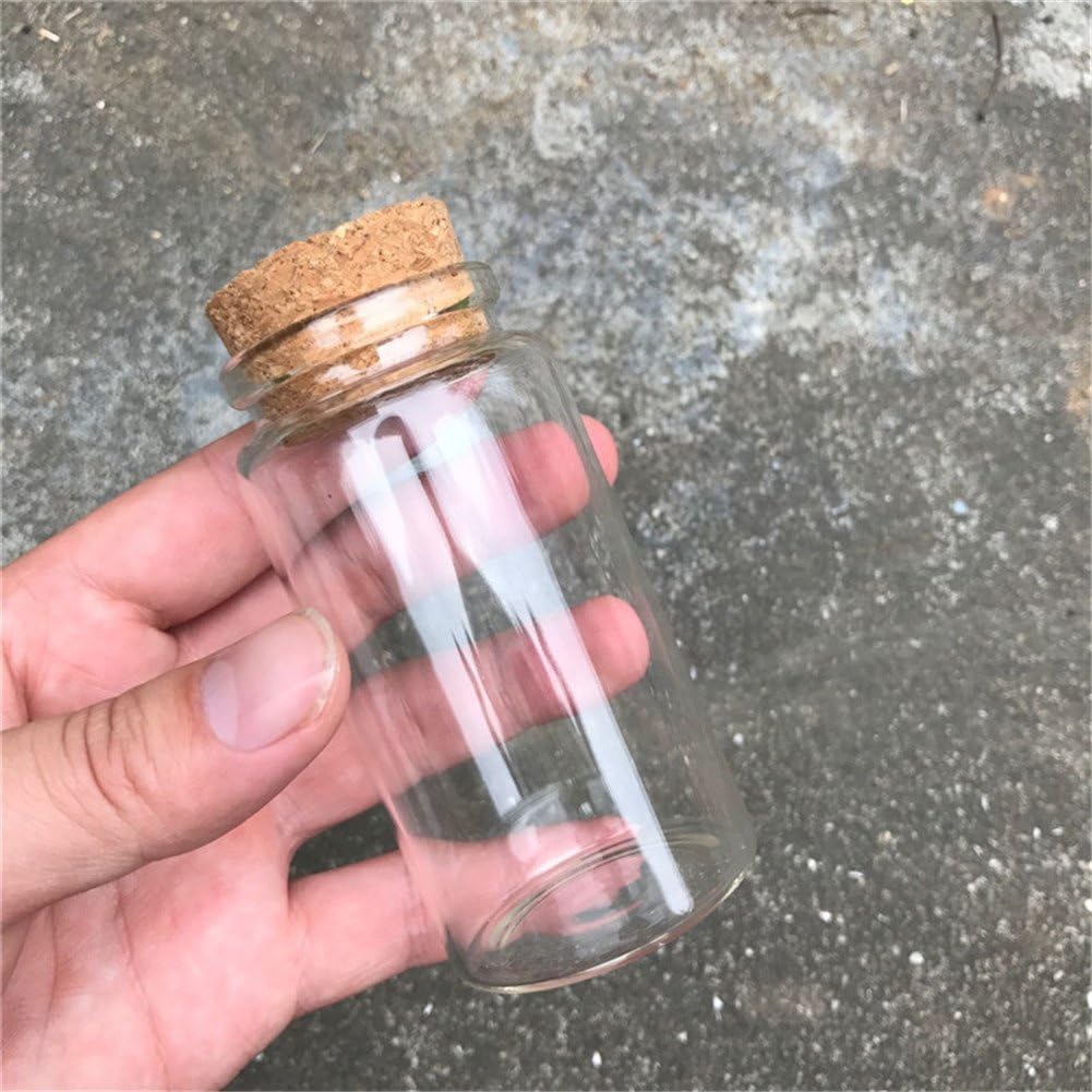 Capacity: 100ml Outside Diameter: 47 mm Opening: 33mm Tall: 90mm Quantity: you will get 24 bottles with corks colour: Clear Transparent Materials: Glass Bottle With Cork Stopper use: Crafts, Mini Glass Bottles, Empty cosmetic containers, Spice Bottles Wedding Gift,Jars ,Vials,Wish Bottles Candy Vanilla Pill Food Bottle