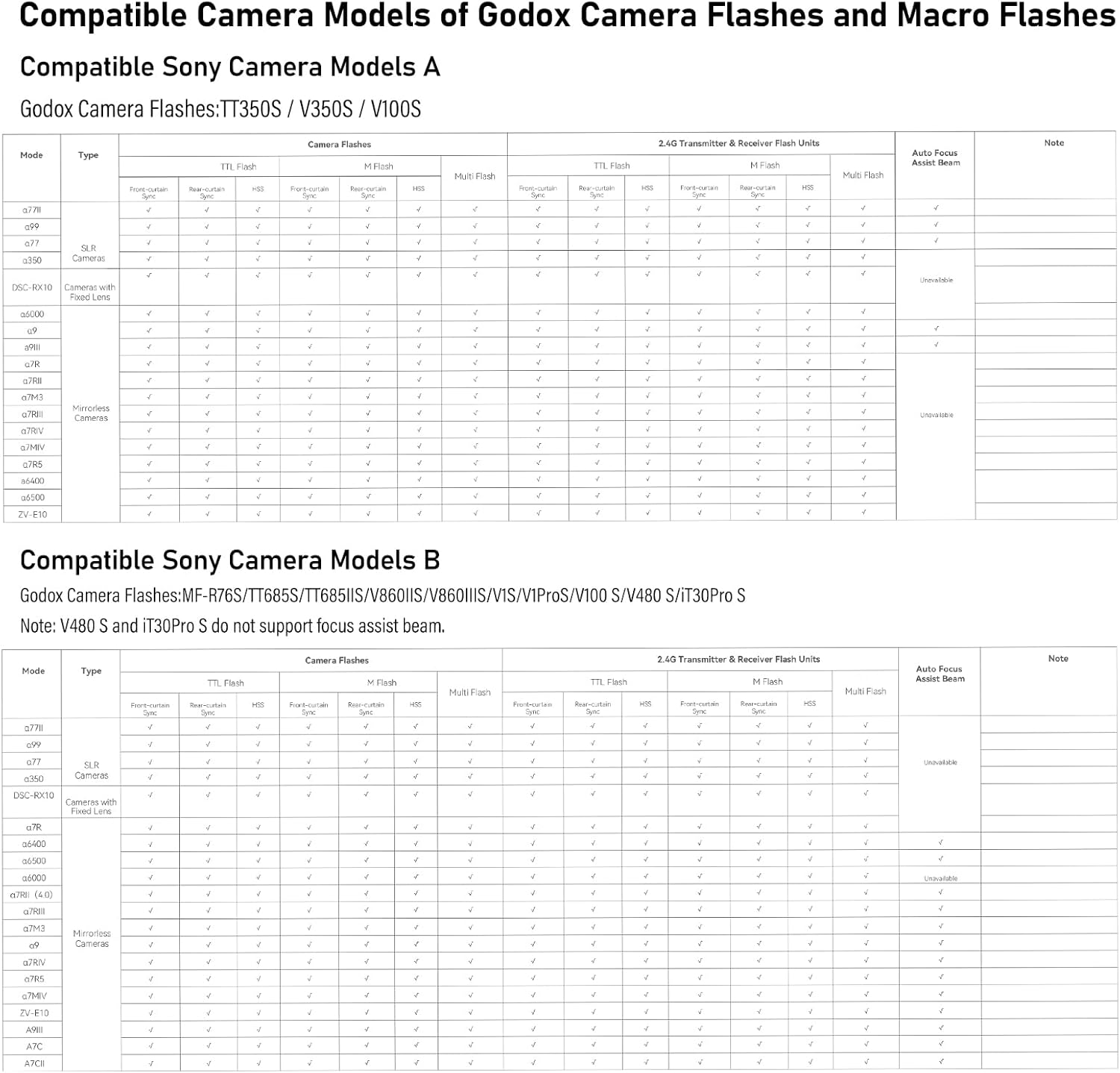 | Compatible Devices | Sony a77 II, a99, a77, a350, DSC-RX10, a7R, a6400, a6500, a6000, a7R II (4.0), a7R III, a7M3, a9, a7R IV, a7R V, a7M IV, ZV-E10, A9 II, A7C, A7C II |