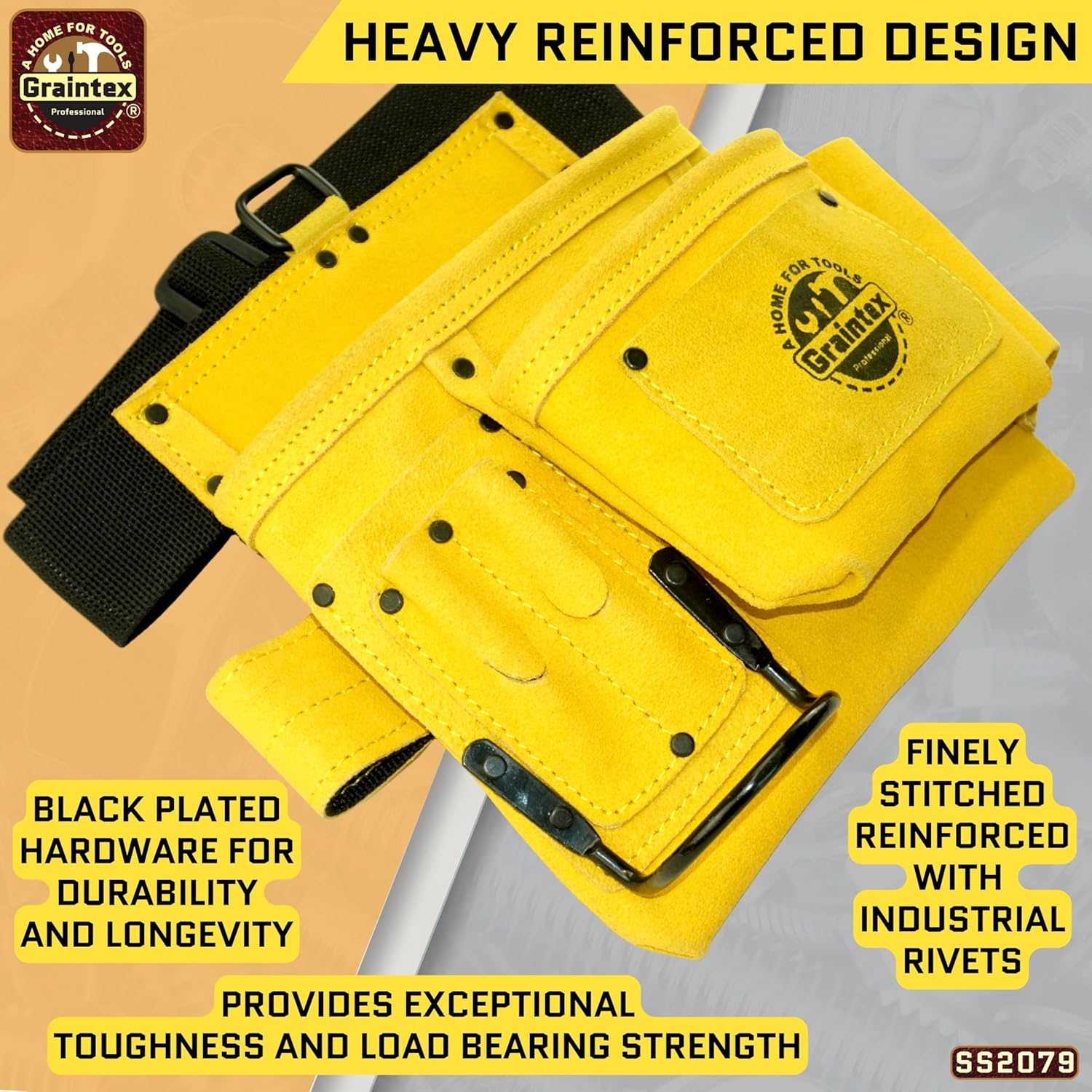 | Item Type Name | 5 Pocket Nail & Tool Pouch Yellow Color Suede Leather with 2” Webbing Belt for Constructors, Electricians, Plumbers, Handymen |