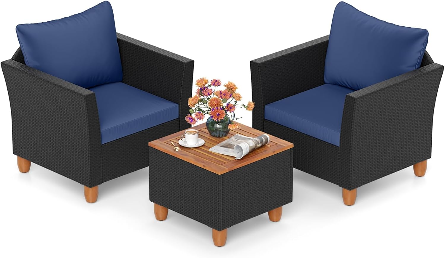Description: Are you still looking for a suitable outdoor conversation set? Our stylish yet practical sofas and table set will be a perfect addition to your indoor and outdoor area. This set consists of a table and 2 wicker sofas, creating a charming conversation environment for your patio, garden, poolside, balcony and more. The acacia wood tabletop is durable enough to resist water and offers ample space for your daily items. In addition, ergonomic backrest and armrests give strong support and make you totally relax. There are seat and back cushions on each sofa for better using experience. And the cover is removable and washable.Assembly Note: Please do not tighten the screws until the assembly is complete, otherwise some screw holes may not be aligned, resulting in different lengths of furniture legs.Features:Weather-resistant PE rattan can stand the test of time Heavy duty and rustproof steel frame features strong loading capacityErgonomic armrests and backrest for strong supportBoth table and chairs have non-slip foot pads for added stabilityBreathable fabric and soft sponge cushion for cozy experienceAcacia wood tabletop with slat design for easy drainage Perfect addition to your patio, garden, poolside and so onThe cushion cover with zippers is removable and washableSpecifications:Color of PE Rattan: Mix BrownColor of Cushion: Beige/Navy Blue/Black/GreyMaterial: PE Rattan, Steel, Acacia Wood, Polyester, SpongeTable: 20" x 20" x 16"(L x W x H)Chair: 29" x 26" x 27.5"(L x W x H)Seat Height from the Ground: 12.5"Weight Capacity of Table: 165 lbsWeight Capacity of Each Chair: 400 lbsPackage Includes:1 x Table2 x Chairs2 x Back Cushions2 x Seat Cushions1 x Instruction