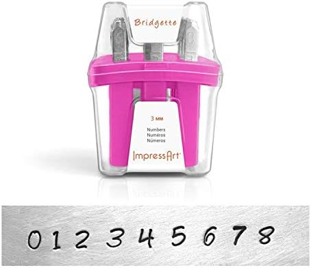 This is a set of numbers letter stamps in the "Typewriter" font. The engraved number measures approximately 3mm in height. Set includes 9 stamp numbers 0-8. (number 9 can be reversed to 6) The letter stamp set comes in an exclusive ImpressArt storage case. Each stamp is stored with corresponding letters and numbers for easy organization.
