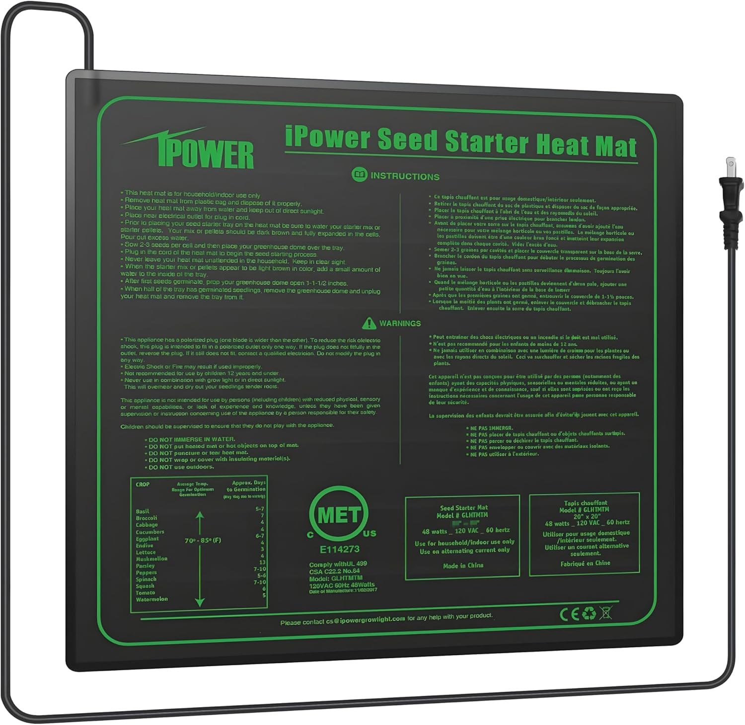 Seeding heat mat makes a perfect warm germination station for indoor growing. Provides constant temperature to improve vegetable, plant, herb, and flower seed germination. Also can use to brewing beer, tea, yogurt or fermenting kombucha. Features: (1) 3" x 20 " heat mat. (2) Supple, flexible, the sturdy edge design. (3) Heating film structure ensure uniform heating. (4) Heat mat have a temperature adjustable controller knob, temperature can be adjusted manually. WARNINGS: Fire or electric shock may result from improper use. Make sure that the surface under the mat is free of sharp points or objects that might puncture the mat. Do not place mat inside tray or cover directly with soil or growing medium. Do not place any heat insulating materials over the heat mat, as it may cause it to overheat. NOTE: Although this heating pad is waterproof, but because of its internal circuit structure, it is forbidden to put the heating pad in water to avoid serious consequences; recommended use a wet towel to clean.
