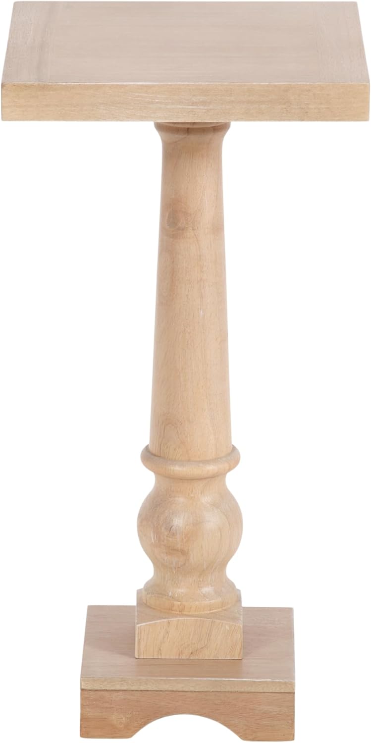 Introducing our beautifully crafted Butterfield wooden drink table, the perfect addition to any living room, home office, or sunroom. Made from a careful blend of natural solid wood and wooden material, this table offers a traditional turned leg and a sturdy, reliable surface to hold your drinks, plants, or any items you may need within reach. Measuring 24.25 inches in height and 12 inches wide, this square table is the perfect size to fit next to your favorite armchair or couch. The light natural finish of the wood provides a traditional or coastal look that complements any decor style. Not only is this wooden side table functional and stylish, but it's also durable and long-lasting. The mango wood veneer tabletop ensures that it can withstand regular use and will feature unique woodgrains. Plus, its compact size makes it easy to move around and store when not in use. This versatile table is perfect for enjoying a relaxing evening at home or hosting a gathering with friends and family. The three-step assembly instructions are clear and concise, making it a breeze to put together in just a few minutes.