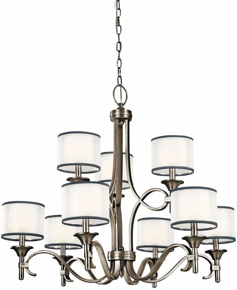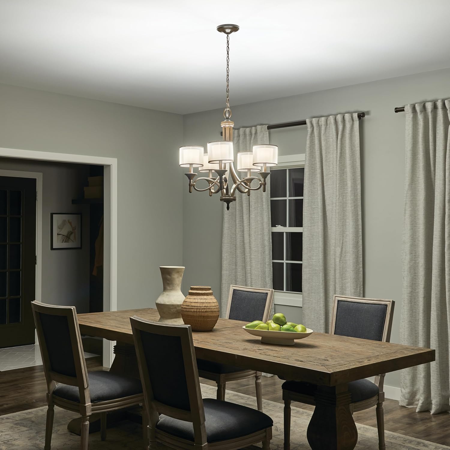 Product Description The Lacey 26" 5 light chandelier features a classic look with its Venetian detail of curves in Mission Bronze finish and satin etched cased opal inner diffusers and light umber translucent organza outer shade. The Lacey chandelier is perfect in several aesthetic environments, including transitional and traditional. From the Manufacturer The Kichler Lighting 42381MIZ Lacey 5-Light Chandelier offers a beautiful contrast, melding the charm of olde world style with clean modern-day materials. The fixture features a mission bronze finish and bold, unadorned rounded-arm styling. Whether you are looking for that perfect chandelier for your great room, dining room, or foyer; this fixture features avant-garde double shades made of decorative mesh screens and opal inner glass making it the perfect choice for anyone looking to bring a transitional feel to their home. The 5 light chandelier is perfect for medium-sized rooms and foyers and measures 25-Inch wide, has a body height of 26-Inch, and an overall height of 100-Inch. The 42381 comes with 65-Inch of extra lead wire included in every box and uses five candelabra base B10, 60W (maximum) bulbs. Pairing with any of the Lacey family (all sold separately) will surely make a stunning statement. An additional chain 2996MIZ is also available. This fixture is sold one per package and is certified and listed to UL/CSA/ETL standards for dry location use in the USA and Canada. Since 1938, Kichler Lighting has offered a distinctive array of lighting solutions that reflect your individual personality, tastes and plans. Kichler brings you an unparalleled variety of exciting style families, unique finishes, fresh colors and unequaled quality. Whether it's casual, contemporary, transitional or traditional, you'll find it with Kichler, lighting that defines your style.