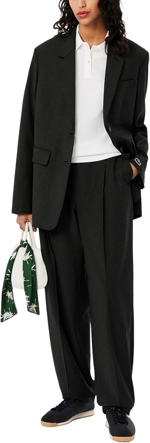 These pants showcase 90 years of Lacoste expertise with a loose cut, cool wool, subtle plaid print, and front darts for a chic look.