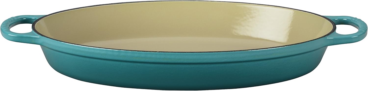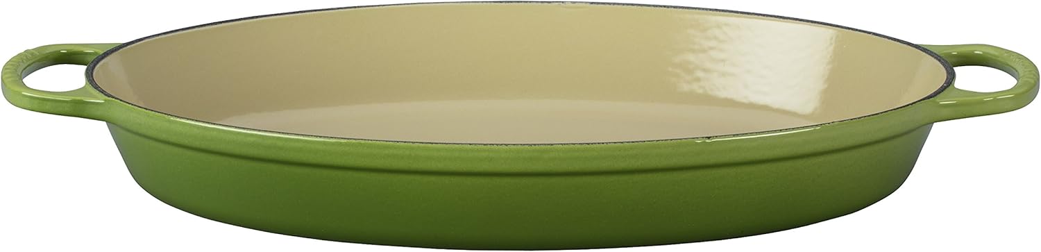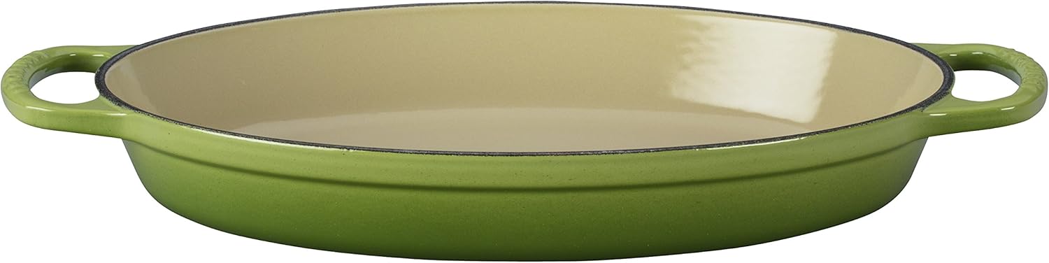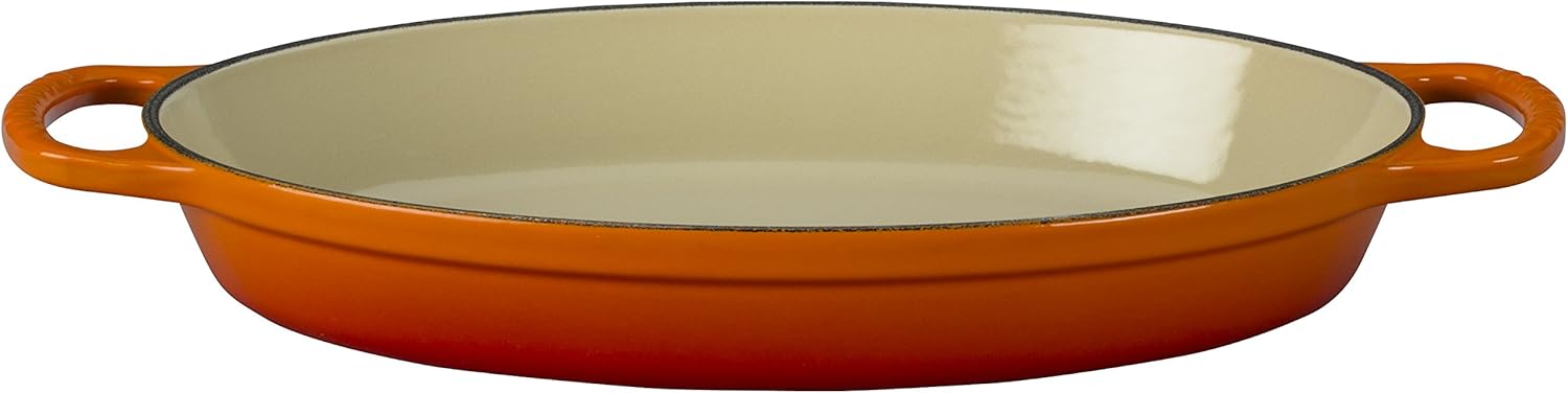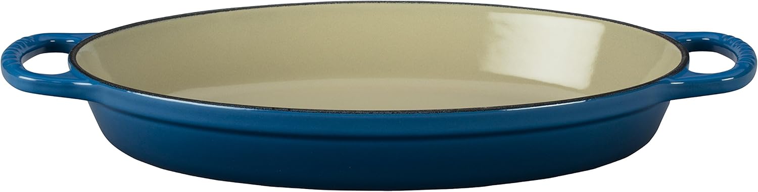 For recipes that call for a crisp topping, this classic au gratin dish provides a wide, shallow cooking area that offers more exposure to heat, while its cast-iron construction makes it useful for everything from deglazing to baking. The oval-shaped dish makes it easy to beautifully present delicious potatoes au gratin as a side for dinner or bubbling fruit cobbler for dessert. Like other pieces in le Creuset's line of enameled cast iron, the cookware's exterior features a colorful, long-lasting enamel that resists chipping and cracking, while its durable, nonreactive sand-colored enamel interior offers a smooth surface for cooking and an optimal palette for food presentation. As cast iron is unexcelled for even heat distribution and superior heat retention and enamel is impervious to acids and odors, the dish cooks food uniformly and gently without hot spots and can be used for marinating, cooking on the stovetop, or finishing in the oven. The cookware also provides traditional scalloped side handles for a secure grip and it can be safely used at any oven temperature, under the broiler and on any stovetop, including induction. Best of all, it moves gracefully from the oven to the table for serving to the refrigerator or freezer for storing leftovers. The cookware carries a lifetime limited warranty and should be hand washed for best results. Amazon.Com.