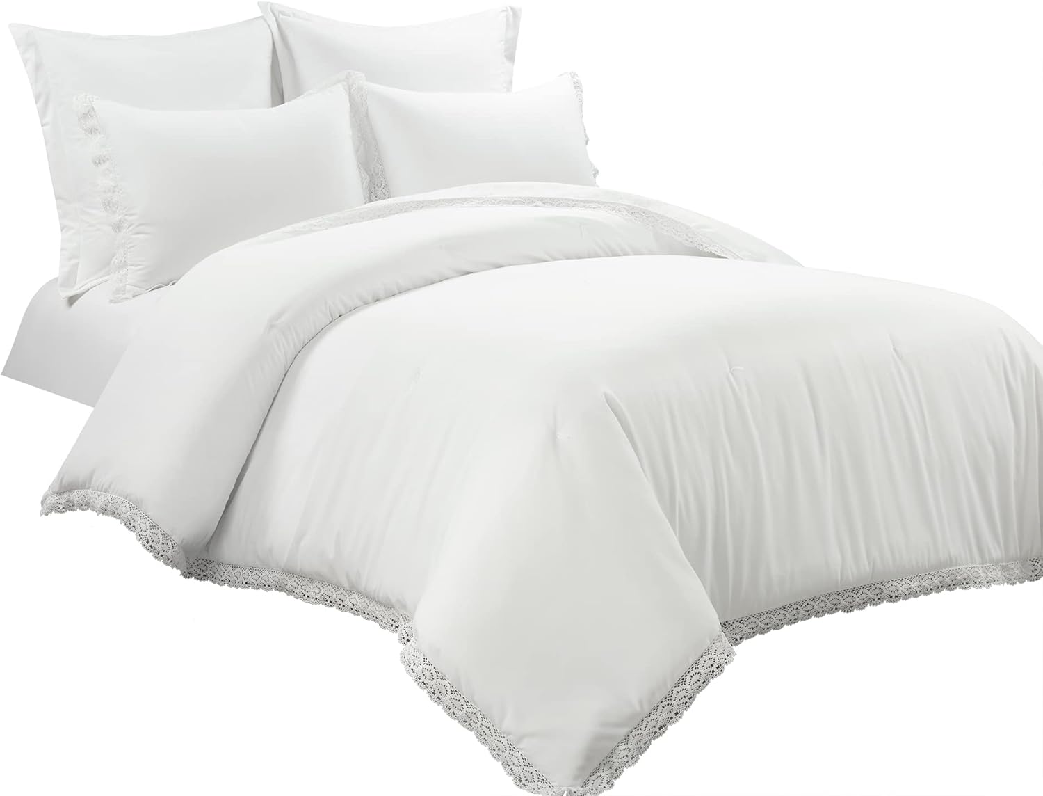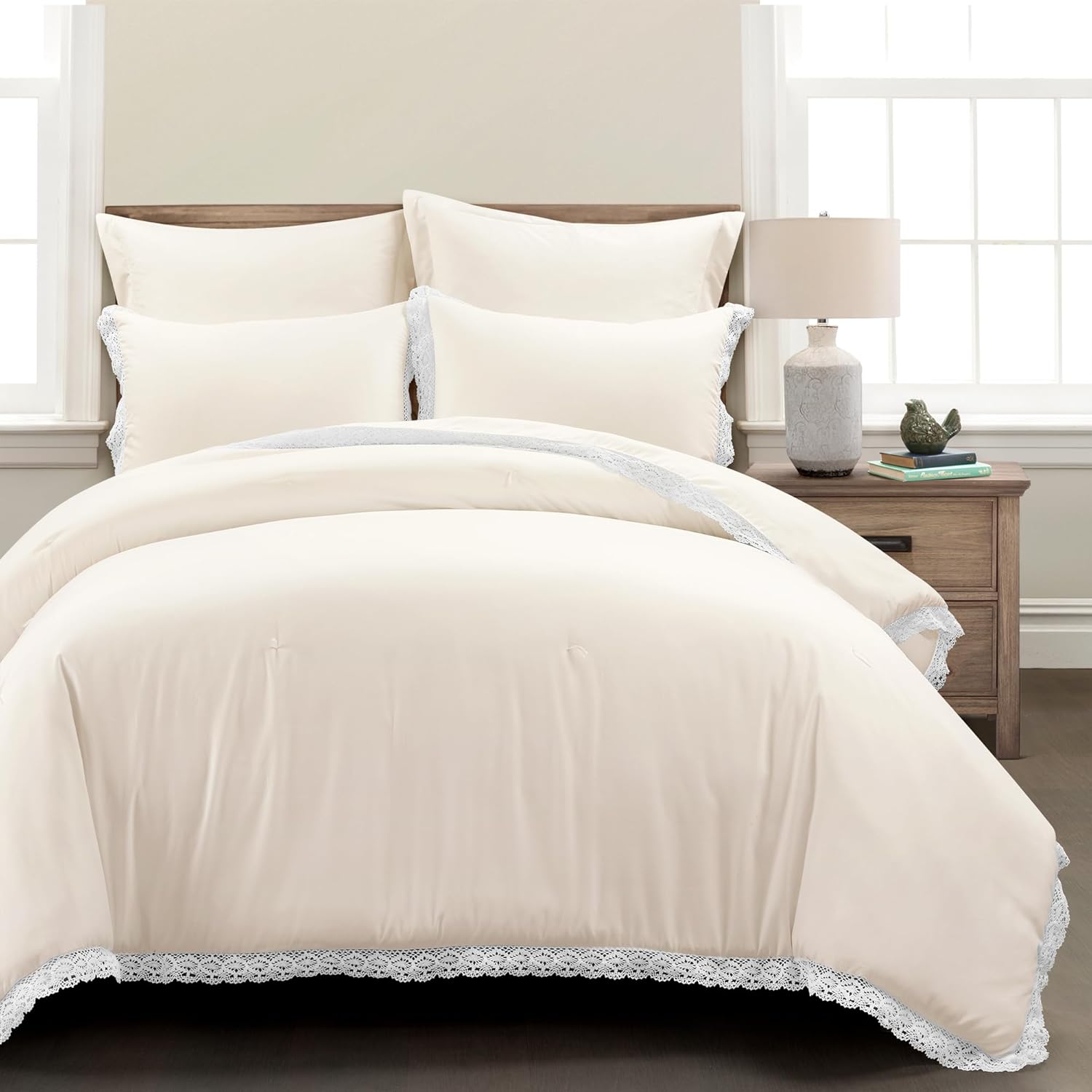 Unwind in style with this cottage core inspired Rosalie Embellished Lace Comforter Set. This bedding's simple design of neutral solids decorated with a romantic white lace trim makes it easy to style into your existing bedroom decor and layer with accent pieces. Decorate your primary or guest bedroom with this simple yet stylish design, adding subtle texture and charm to your space. This dreamy king bedding set seamlessly blends into vintage, cottage core, French country, minimalist or farmhouse decor styles. The romantic lace detailing adds elegance and a bit of texture to your bedroom design. Wrap yourself up in ultimate comfort and warmth with this lovely full/queen comforter set. This 5 piece bedding set includes 1 comforter, 2 pillow shams, and 2 euro shams. This product is STANDARD 100 by OEKO-TEX® certified, all components have been tested and certified free from harmful substances. To care for this set machine wash cold on the gentle cycle and tumble dry low. Please refer to label for full care instructions.