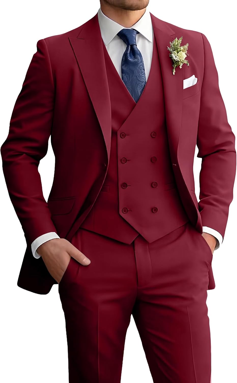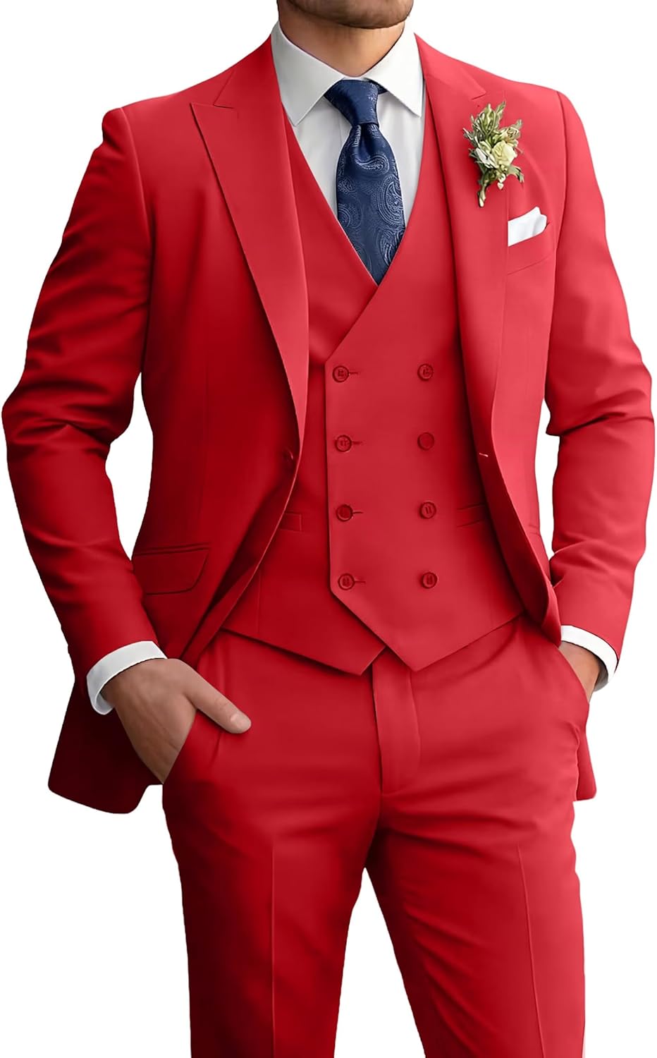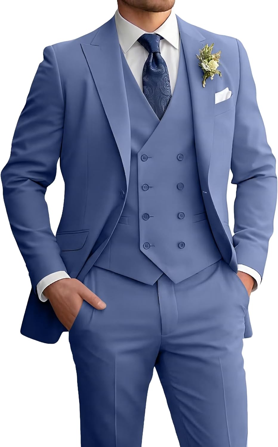 Mens Suits 3 Piece Slim Fit Suit Set Men Tuxedo Formal Business Wedding Suits Blazer Vest Pants ● Fabric: 80%Polyester+20%Viscose. ● Design: Blazer: Peak lapel collar, 3 functional pockets; Vest: Double-breasted, V-neck, adjustable back strap; Pants: Zipper closure, elastic waist,2 slash pockets.